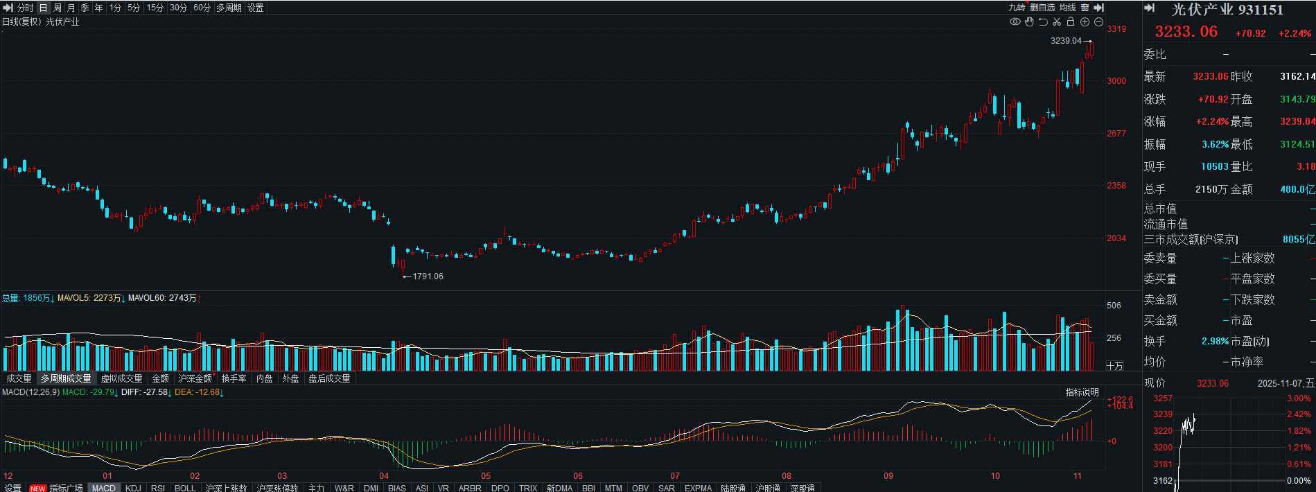 光伏真的是强者恒强,今日光伏领涨,光伏产业指数涨幅近2%,日内直接创了新高,附图MACD金叉向上,多头趋势挡都挡不住,当下可以继续格局。