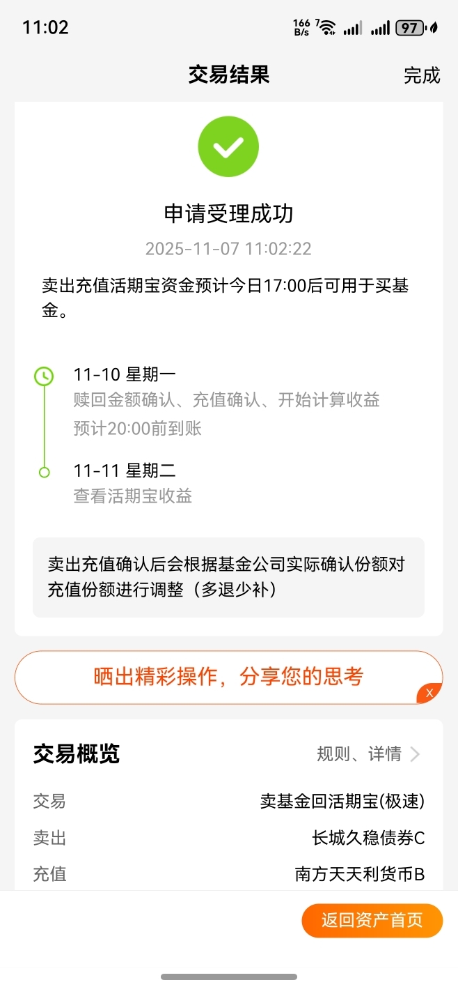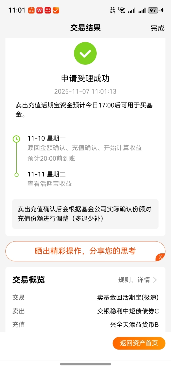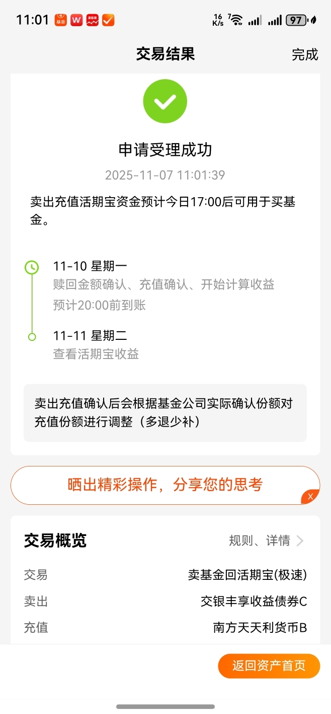 在今天上午,观察目前持有的2个交银债基+某城久稳这三个债基的持有份额,在今天全部都已经超过7天与刚好够7天了。