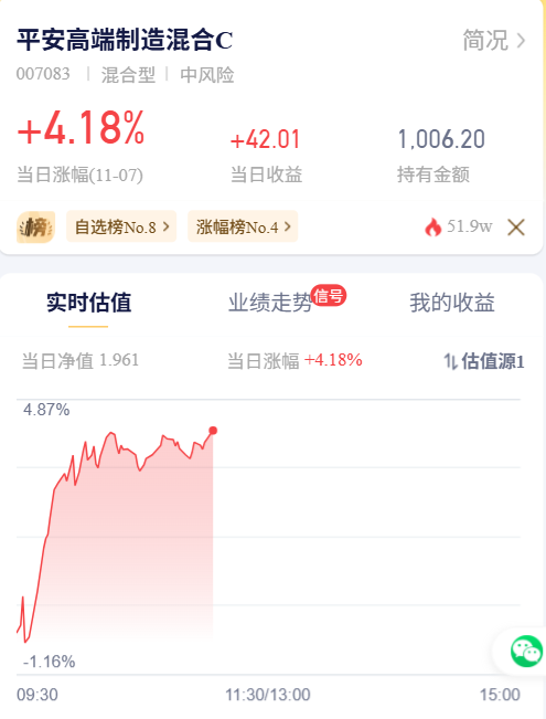 各位兄弟姐妹们,麦爸周三果断入手的$平安高端制造混合C(OTCFUND|007083)$,这波操作简直神了!买完就连涨 3 天,今天估值预计会干到 4%+,目前几乎全市场涨幅第一呀!吃肉吃得明明白白!