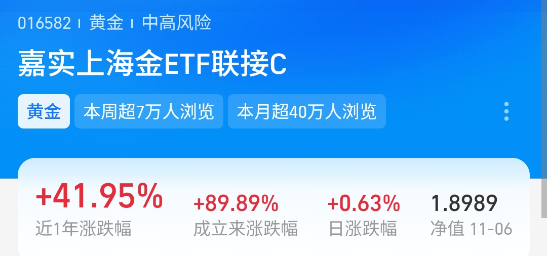 黄金回撤基本到位啦,接下来就是稳稳向上的节奏。我果断入手$嘉实上海金ETF发起联接C$ ,这业绩真的没话说,近一年直接涨了41.95%,昨天还逆势涨0.63%,抗跌又能打,回撤控制得很好。