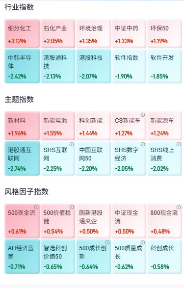 细分化工、石化产业、新材料等板块涨幅靠前,港股通互联、中韩半导体、港股通科技等下跌。