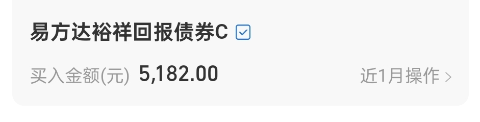 $易方达裕祥回报债券C$ +5000元!易方达裕祥今天估值涨的又是很不错,持仓是红多绿少,今年来债市震荡频繁,隔壁却一直震荡上行,固收加方向体现出了不错的收益能力,不但波动小,而且收益还不错,我个人觉得现在市场轮动较快,想要既稳健又收益好,固收加是个不错的方向,今天裕祥表现又不错,个人顺势而为,继续向易方达裕祥发车五千元!裕祥是一个偏债型固收加,有少量的权益类来增厚收益!其中信用债61.77%,利率债14.43%,可转债5.44%!权益类占比19.49%,其中包括消费 制造 周期 医药 基建地产等!整体来看持仓均衡,不单压某一个板块!该方向昨天收蛋19个,近六个月收蛋476个,近一年年化收益率6.26%,整体来看红多绿少,近一年最大回撤181个蛋,在固收加里,这样的回撤要好于同赛道!固收加的魅力在于它既有稳健的债当压舱石,又有权益类增厚收益,波动会比纯债要大,但是适合当下行情,我个人今天继续上车一些,后续再来!