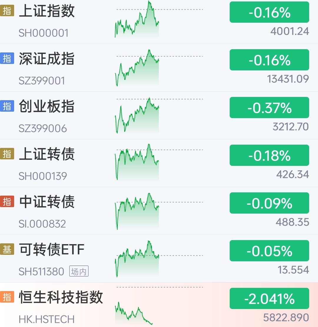 中午好,上半场已经结束,今天盘中的拉扯还蛮大,截止到午间收盘三大指数还是绿:上证指数-0.16%,深证成指-0.16%,创业板指-0.37%,转债小雨,恒科负两个点,这个以前盈利没走,现在走也走不了,只能逢低补,等待以后红了再做打算!