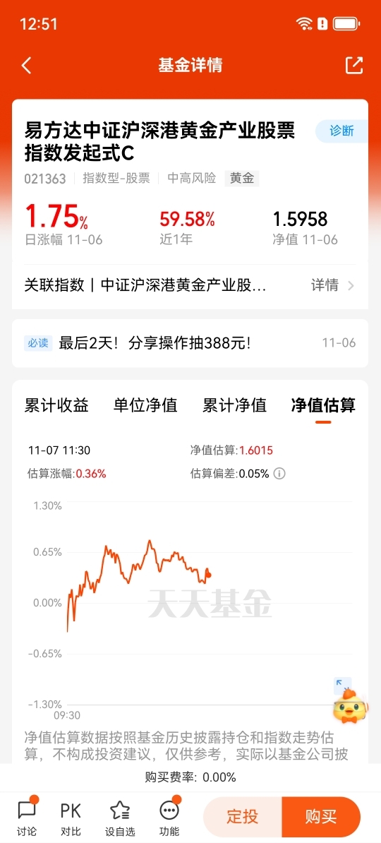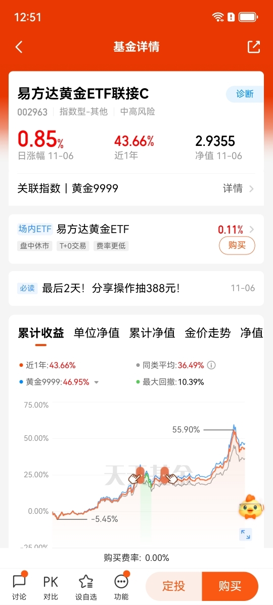 说到投资工具,易方达黄金ETF联接C简直是"黄金界拼多多":白菜价:管理费0.15%+托管费0.05%,比楼下奶茶店还便宜。闪电发货:T+1到账,比外卖小哥还准时。透明厨房:91%仓位直投黄金ETF,持仓比渣男的聊天记录还干净。最绝的是C类份额,持有30天就免赎回费。相当于买菜大妈都嫌手续费贵,但这里手续费低到可以忽略——适合我们这种"三天打鱼两天晒网"的佛系投资者。终极奥义:设置止损线,跌破就跑别逞强。