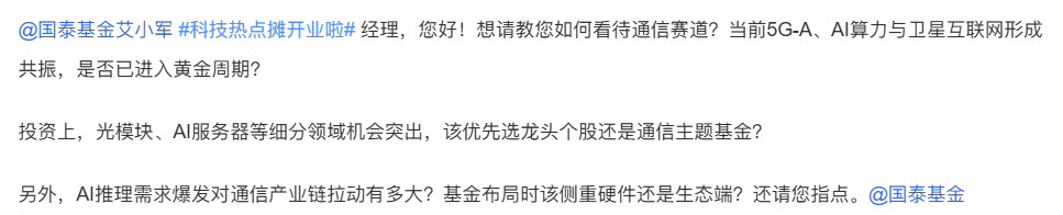 相关产品:$国泰中证全指通信设备ETF联接C(OTCFUND|007818)$ $国泰创业板人工智能ETF发起联接C(OTCFUND|025493)$ $国泰半导体设备ETF联接C(OTCFUND|019633)$ $国泰上证科创板芯片ETF发起联接C(OTCFUND|024854)$