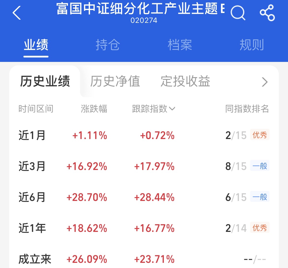 尾盘快到了又发现了一只宝藏基金 $富国中证细分化工产业主题ETF发起式联接C$ 今天股市下跌,有意外惊喜。板块上,化工表现亮眼,涨幅超了2个点,快接近3%。它主要跟踪化工行业指数,持仓选股能力不错,覆盖了不少细分领域的龙头标的。当前估值涨幅3.23%,连续上涨两天,今天已经确定吃肉了,连涨三天,防守能力较强。近一月上涨1.11%,近半年上涨28.70%,阶段性收益出色。在反内卷浪潮推动下,细分化工产业迎来发展新机遇,从政c到供需关系层面来看,行业景气度持续回升,我也加仓一笔,进攻这个方向了