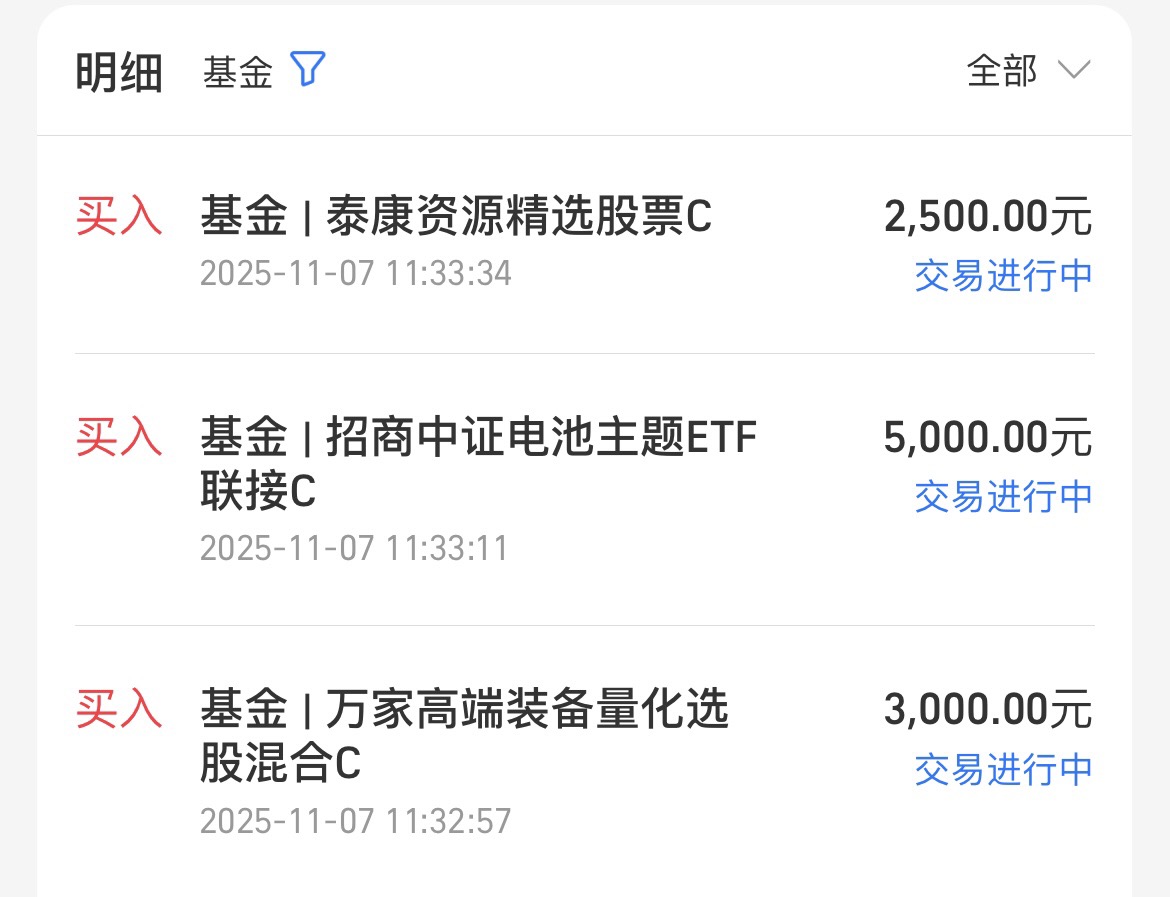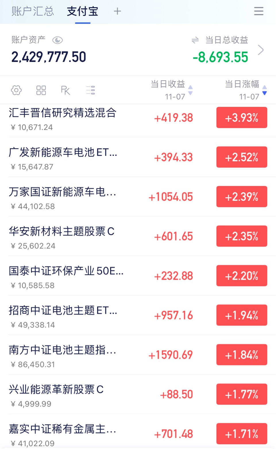 1. 锂电池,上车5000,$招商中证电池主题ETF联接C$ 虽然锂电池是连续三天上涨,但是我丝毫不害怕,从市场的走势上来看,明显出现分化了,一边,科技成长集体回落,一边,新能源屡创新高,市场主线有望转换特别是十一月份十二月份新能源锂电池的机会可能会更多一些。