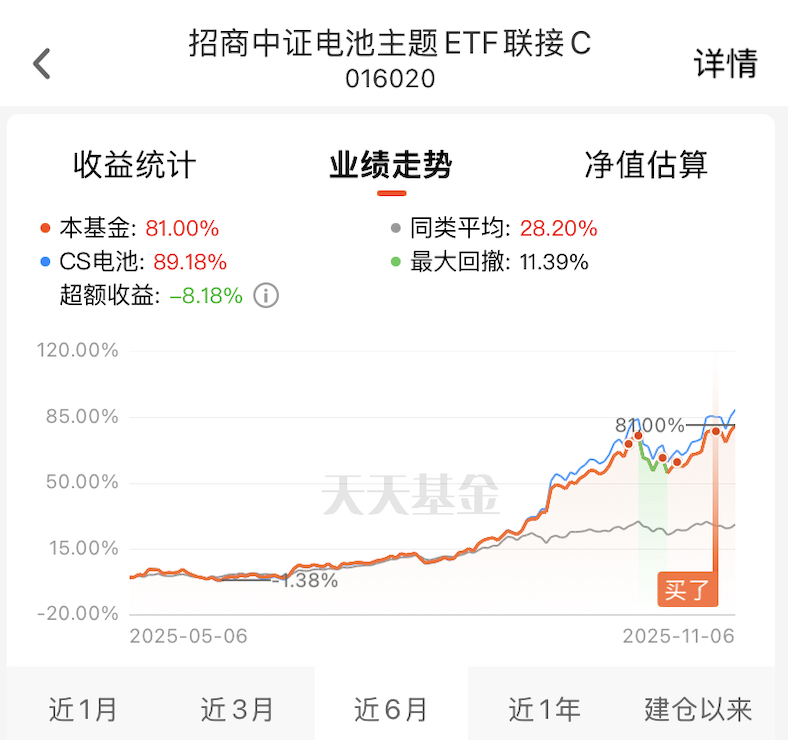 在同类基金中,招商中证电池主题ETF联接C(016020)表现稳健,回撤可控。近三个月在4千多只同类基金中排名第一,紧密跟踪中证电池主题指数,重仓阳光电源、宁德时代、亿纬锂能等龙头企业,业绩显著优于同类平均,兼具成长性与行业代表性。