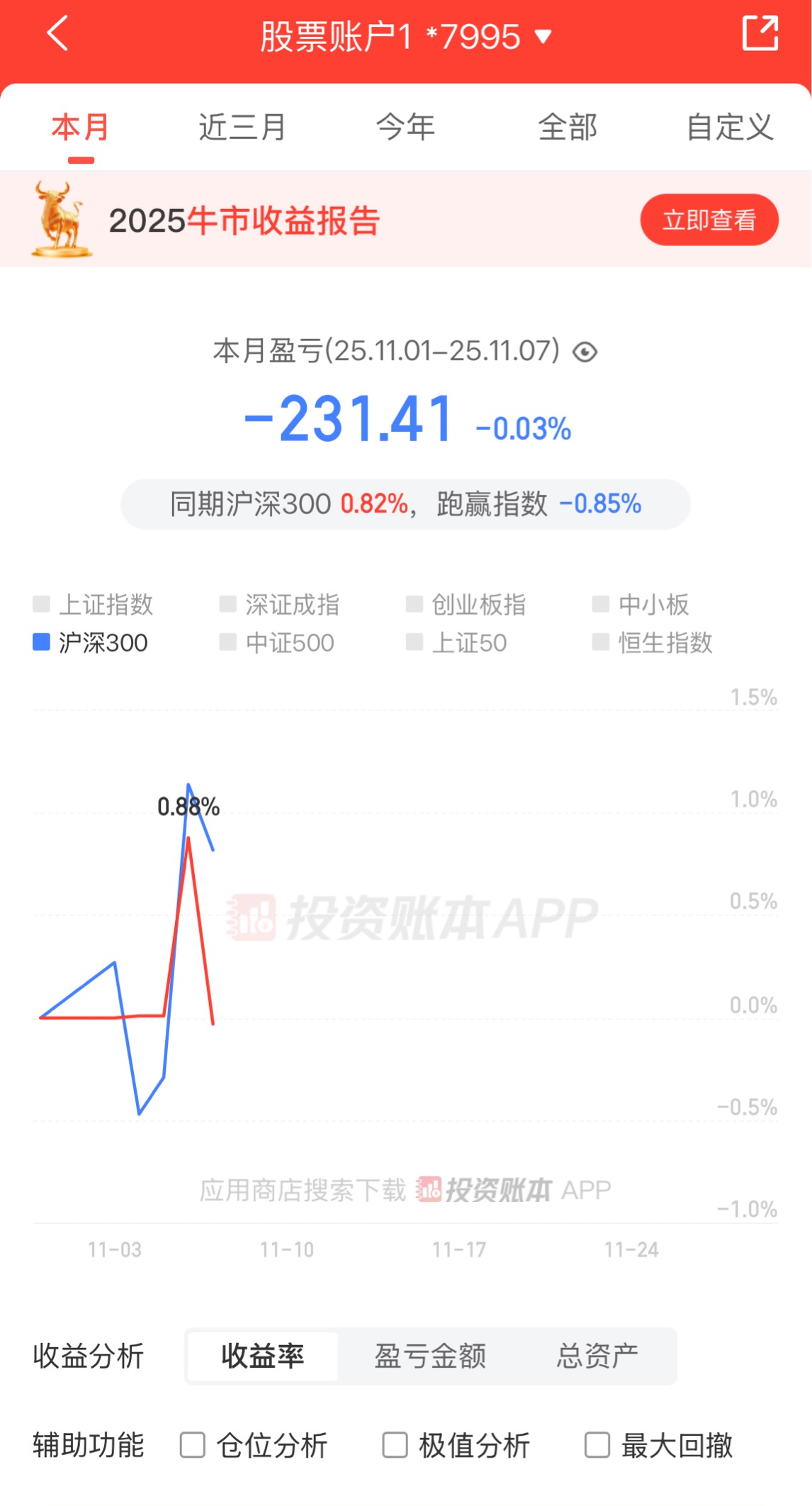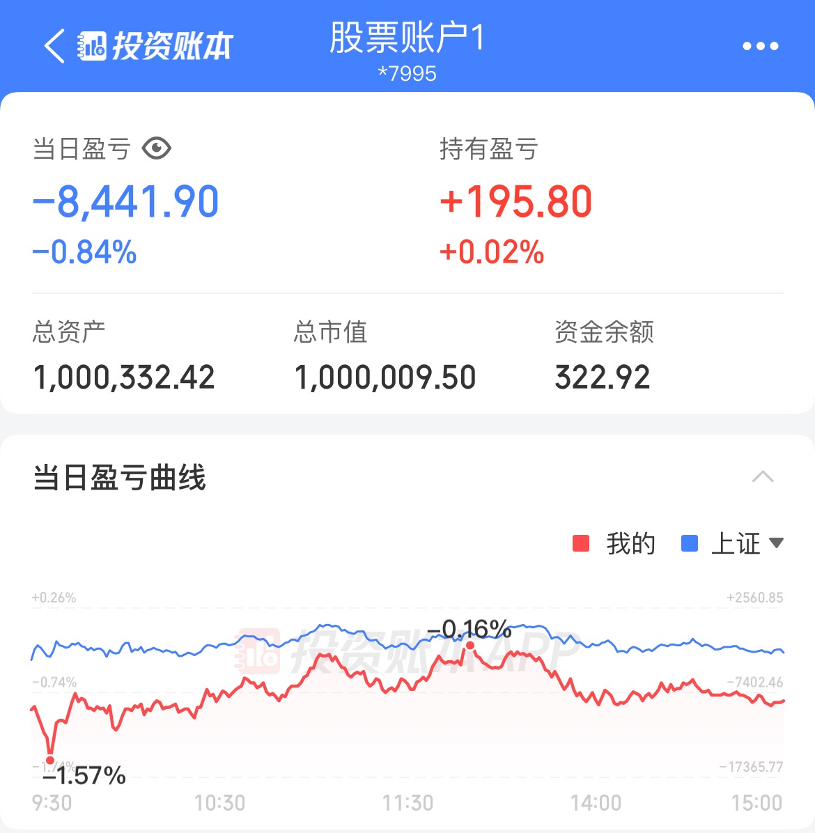 今日账户亏损:8442 元。 11月7日,A股三大指数今日集体调整,截至收盘,上证指数跌0.25%,深证成指跌0.36%,创业板指跌0.51%,北证50涨0.19%。沪深京三市全天成交额20202亿元,较上日缩量557亿元。全市场超3100只个股下跌。 ETF收盘涨跌不一,化工ETF(516020)领涨3.49%,化工龙头ETF(516220)涨3.47%,化工50ETF(516120)涨3.42%。港股互联网ETF(513770)领跌2.89%,港股通互联网ETF(159792)跌2.62%,港股通互联网ETF(513040)跌2.5%。
