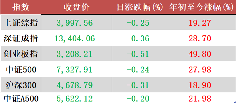 国内主要股指普跌。截至收盘,上证指数跌0.25%,收报3997.56点;深成指跌0.36%,报13404.06点;创业板指数跌0.54%,收报3208.21点。两市成交额19990亿元。行业方面,申万一级涨少跌多,基础化工领涨,涨幅为2.39%;计算机领跌,跌幅为1.83%。