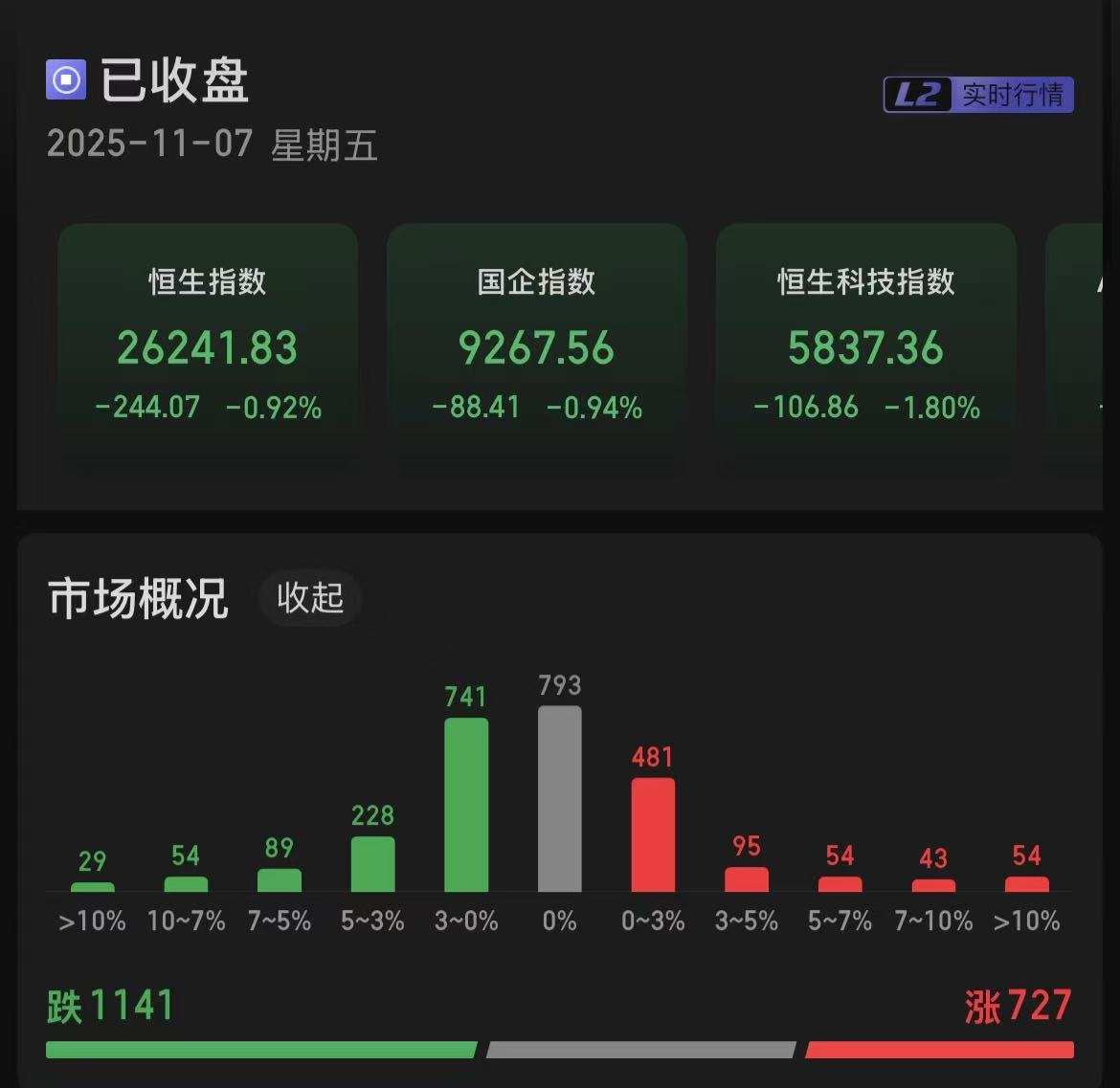 恒生指数下跌0.92%,国企指数下跌0.94%,恒生科技指数下跌1.80%。727只个股上涨,1141只个股下跌。南向资金,净买入75.23亿港元。