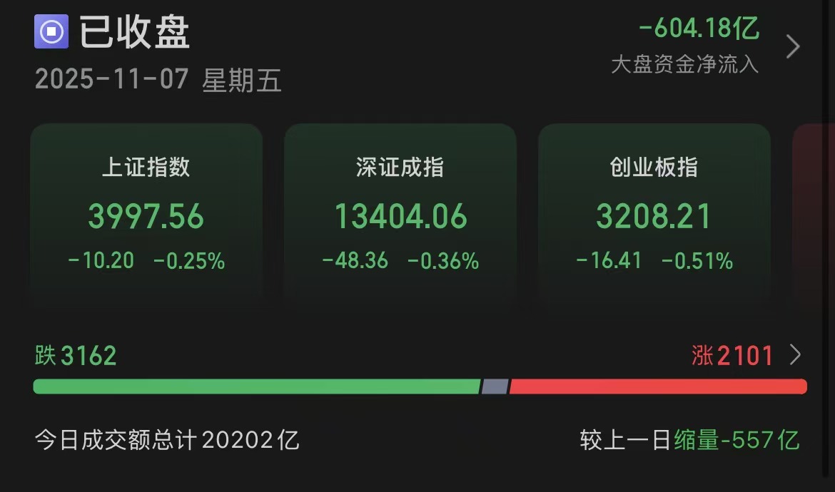 11月7日,A股市场三大指数微跌,市场呈现出“风格切换下的结构性分化”。 资金从高估值、高拥挤度板块向低估值、政策确定性强的赛道转移,新能源产业链爆发,前期热门科技股遭资金兑现。港股市场受科技股拖累整体低迷,但新能源、黄金等板块逆势走强。