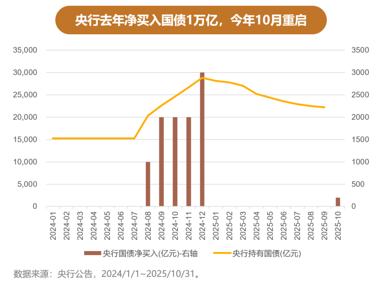 11 月 4 日,央行公告 “10月公开市场国债净买入 200 亿元” ,暂停9个月后正式重启。