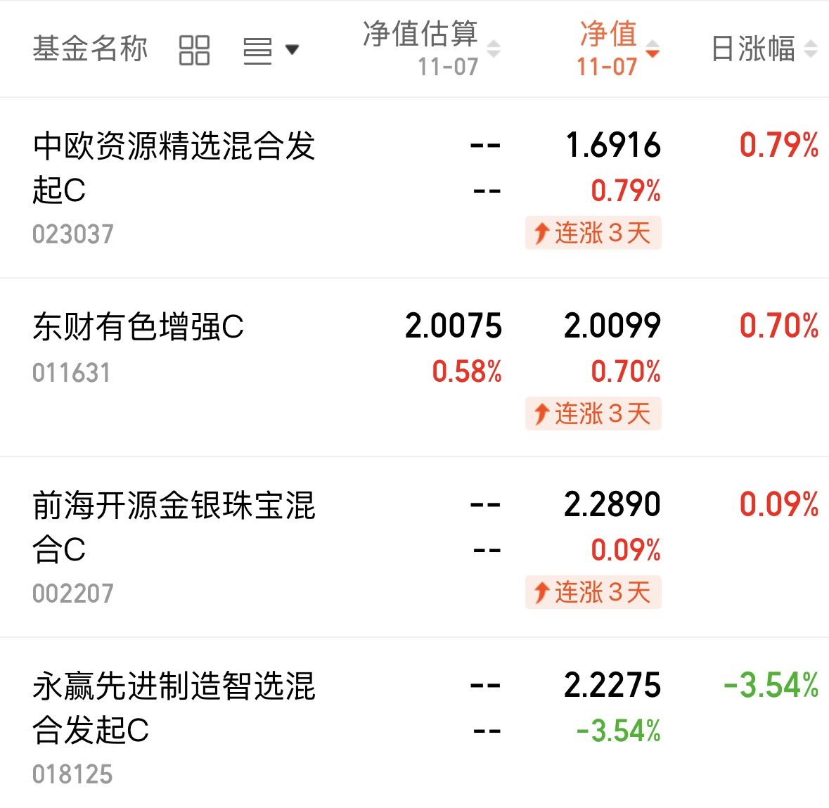 宝子们,沪指还是没顶住啊,失守4000点!关注今晚上美股的表现吧。回看今天资源类的还是比较抗震的,我一直觉得大宗在接下来的今年或者明年后年都会有行情。$中欧资源精选混合发起C(OTCFUND|023037)$更新0.79%,连续上涨三天,不错!