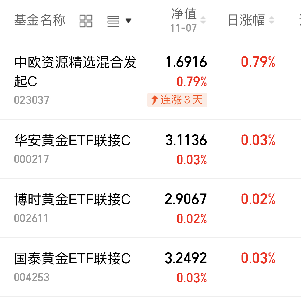 $中欧资源精选混合发起C(OTCFUND|023037)$持仓聚焦资源主线,覆盖铜、铝及黄金领域,今日上涨0.79%,涨幅超过纯黄金类基金,表现不错。