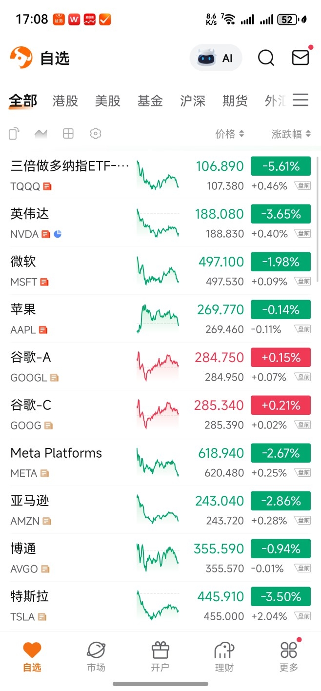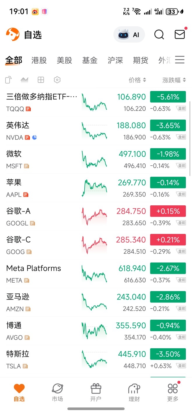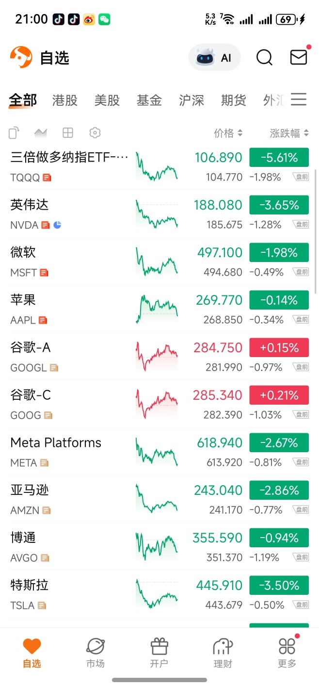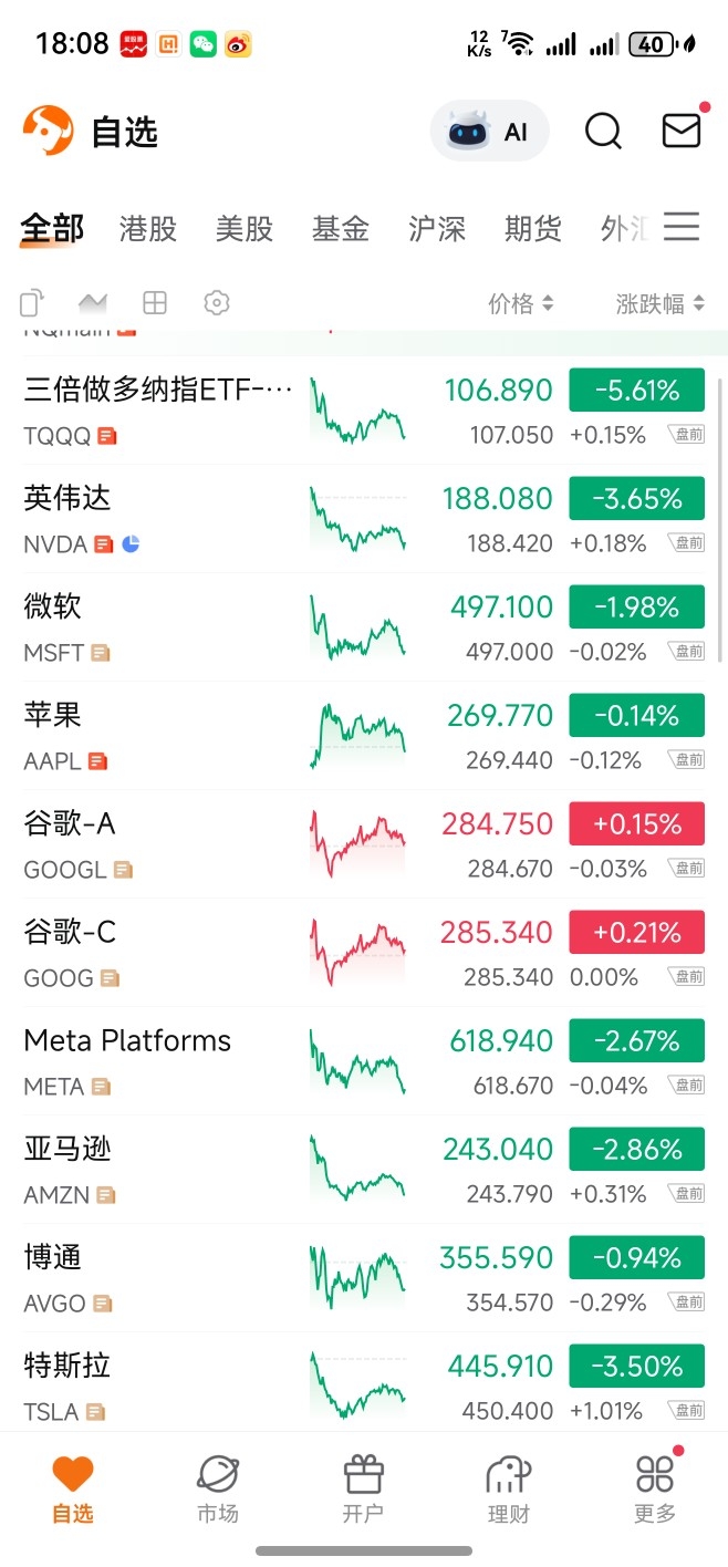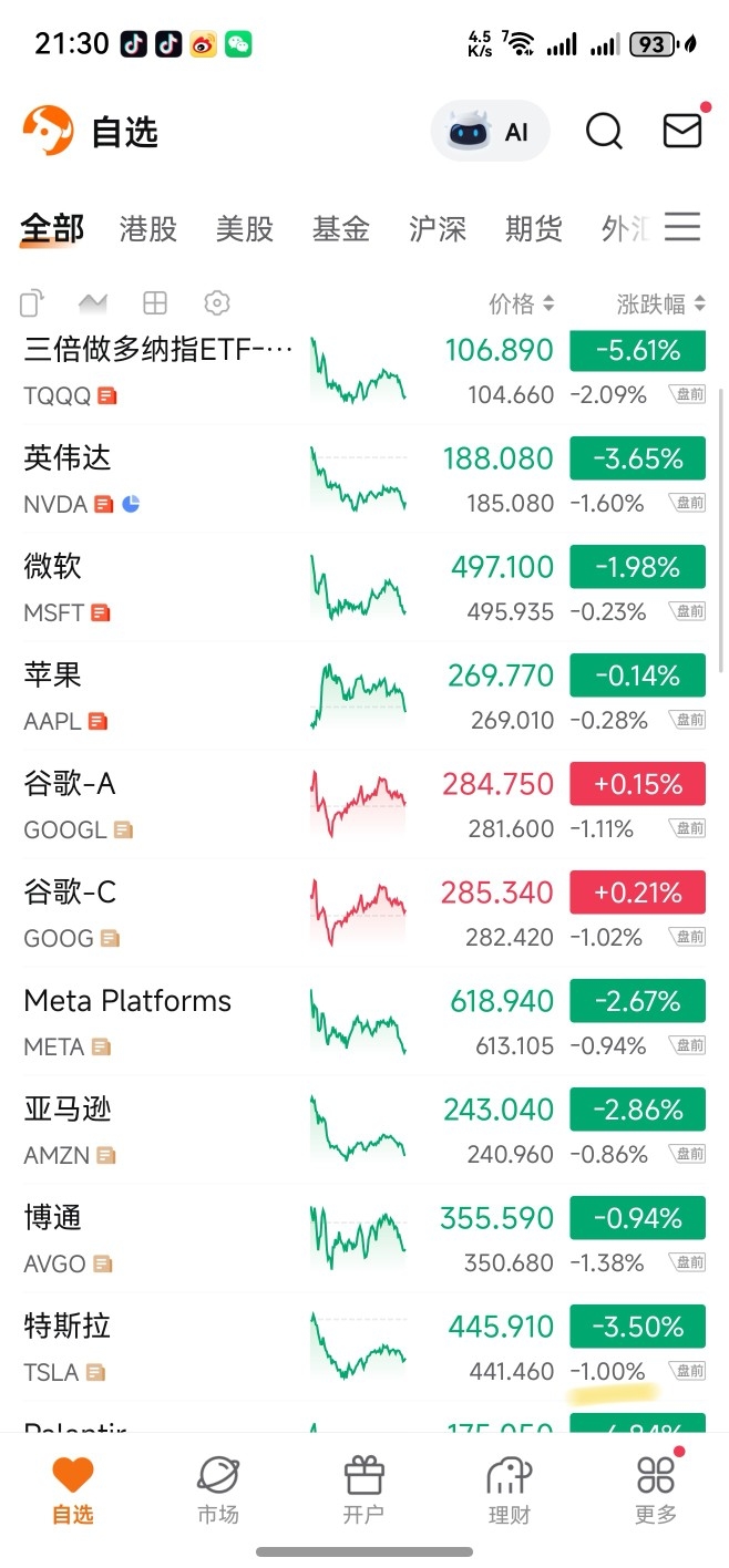 在今天晚上21点30分,观察7朵金花+博通这些,在盘前表现比较差的。观察英伟达、谷歌A,、谷歌 C、博通、特斯拉、这几个在盘前表现都大跌了。