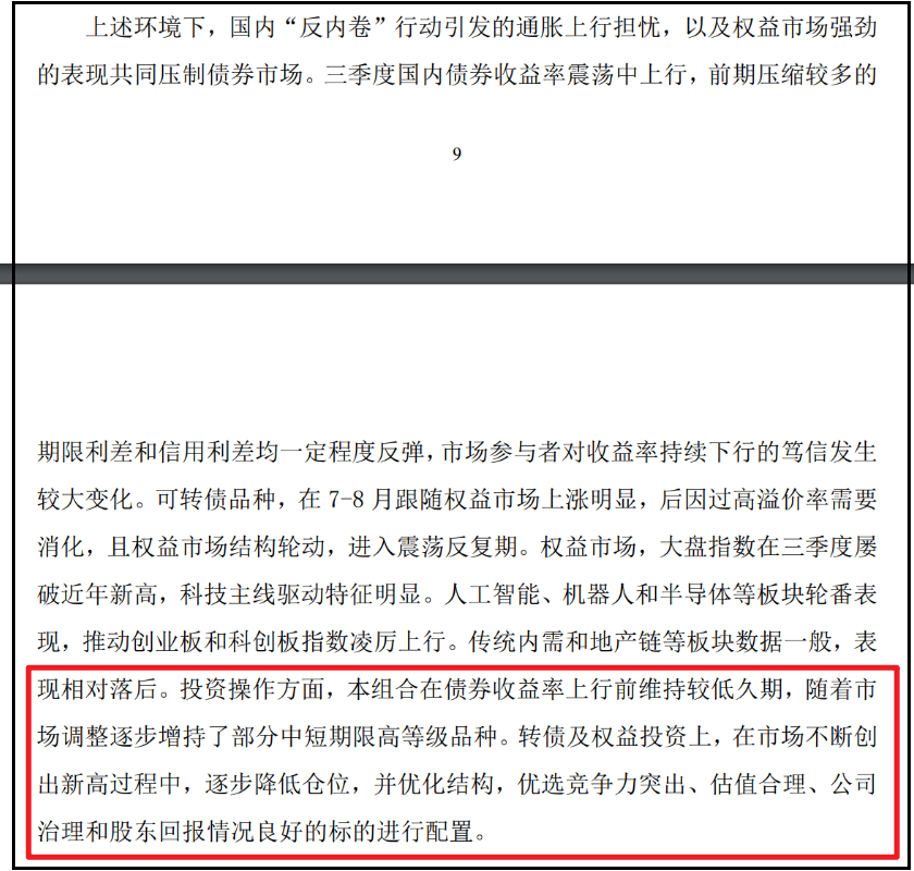 其三季报,也提到,下图,随着市场不断创新高,逐步降低仓位,优化结构,配置估值合理和股东回报良好的个股。