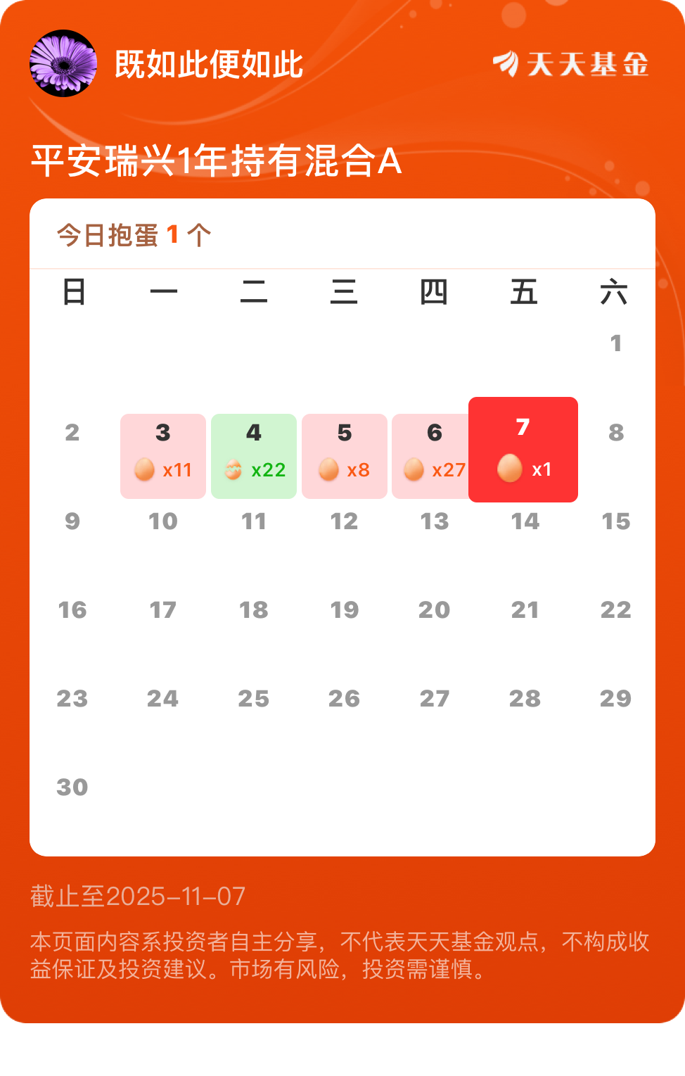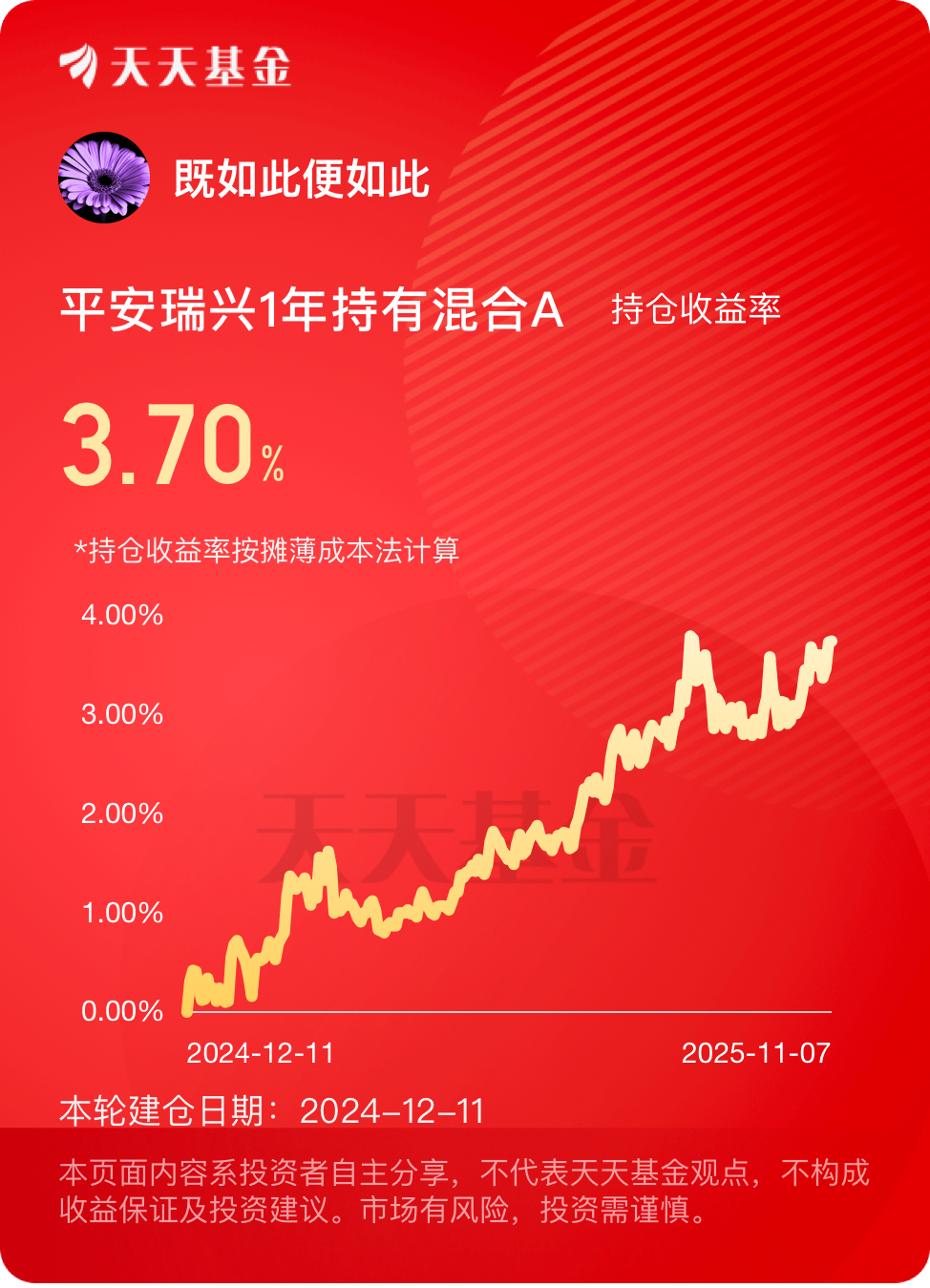 #创作扶持计划# “今三大指数微绿,但这只展现了较强的风险调整能力,一年期持有管住手,也能看到防御能力还是挺好的。12月12日就陆续到期,也是备用的“弹药”。时至年底感觉不太好做,板块轮动太快了,还是紧盯看好的“板块”不动摇,不乱动,踏实守着“见月明”。$平安瑞兴1年持有混合A$ #晒抱蛋收益#