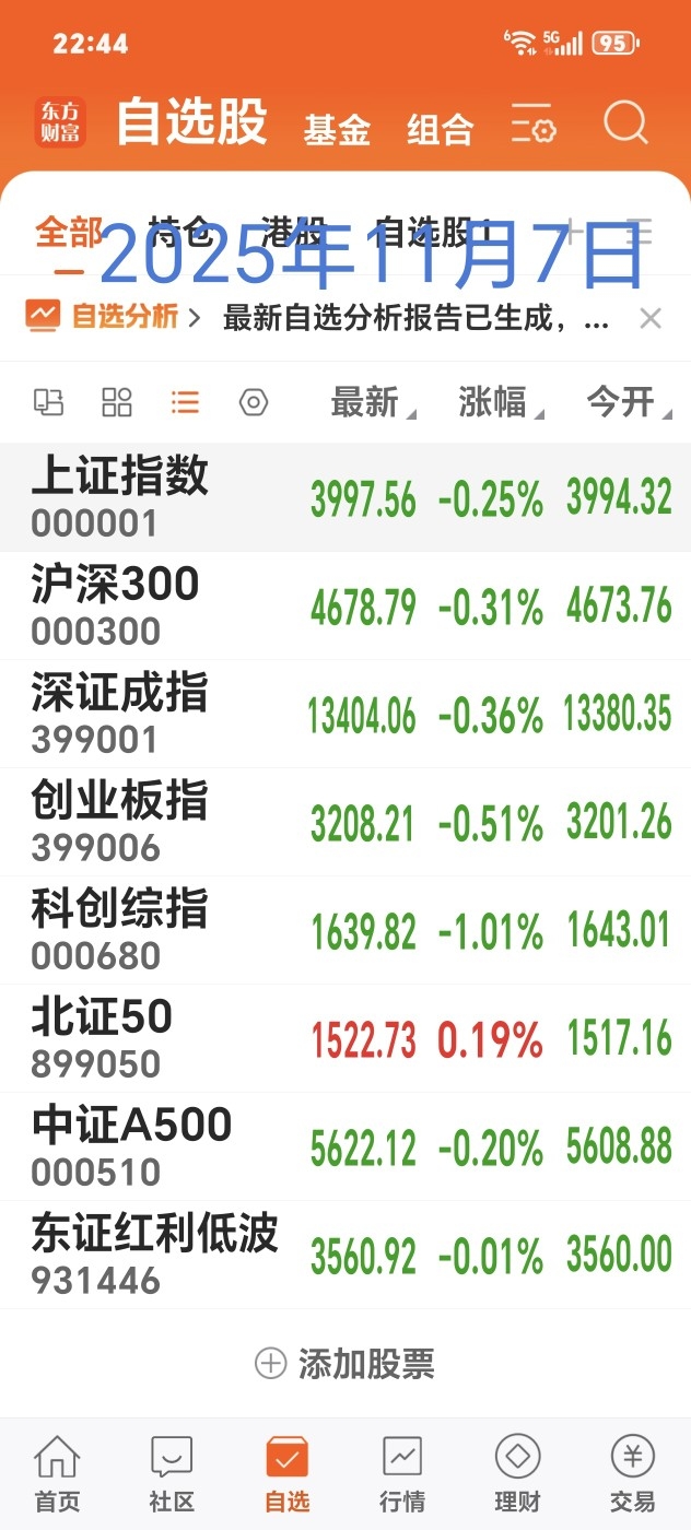 A股,今天5个市场主要指数一涨四跌,一涨,北证50上涨,涨幅0.19%;四跌,上证指数、深证成指、创业板指和科创综指下跌,科创综指跌幅1.01%,其它3只微跌。日K线四阳一阴,四阳:上证指数、深证成指、创业板指和北证50;一阴,科创综指。从A股近期走势分析,市场总趋势仍是上行,当然上行途中难免会出现回调整理。