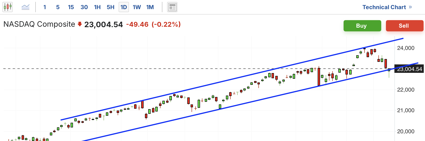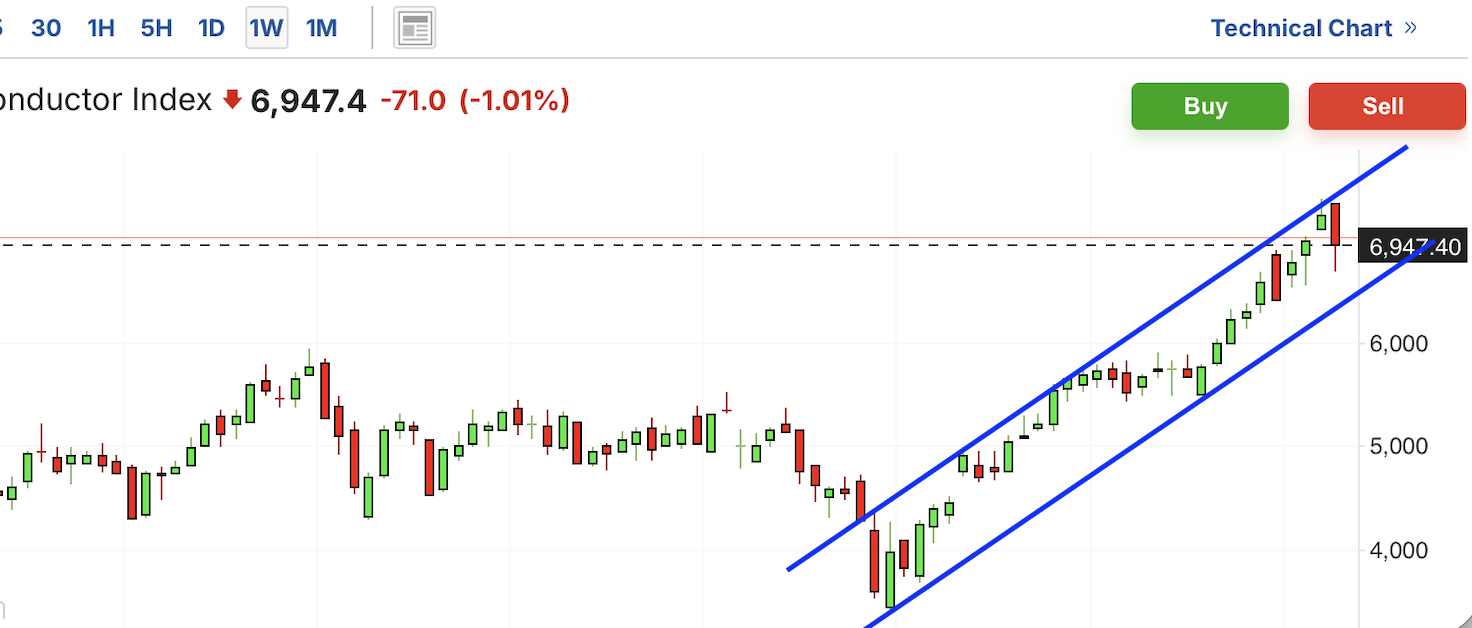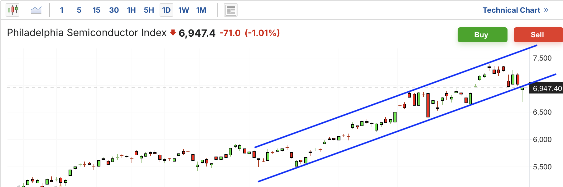 费城半导体近期进入上升通道,最近从通道压力位而回落至支撑位,周五一度大幅跌破支撑,后跌幅收窄,但仍岌岌可危,跌破将有更大级别的回调。