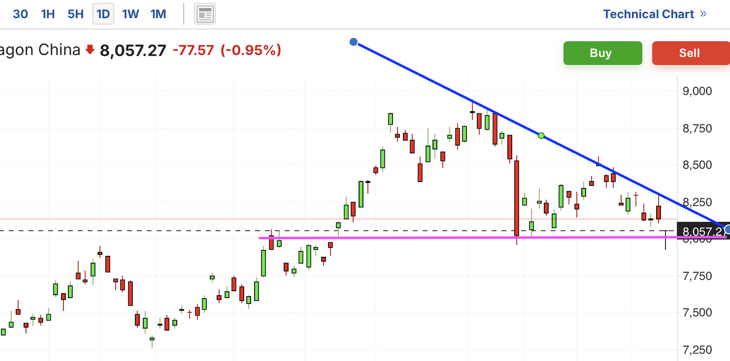 中概股最近跌破上涨趋势线,周五一度大幅跌破支撑位,后反弹回来,目前趋势下行,仍在前低支撑位挣扎,跌破则就此回调。