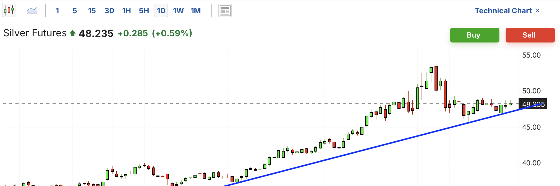 黄金和白银最近有一波行情。因短期涨幅过大形成超买后回落,这几日跌幅放缓,似乎止跌企稳,但没有回升迹象。