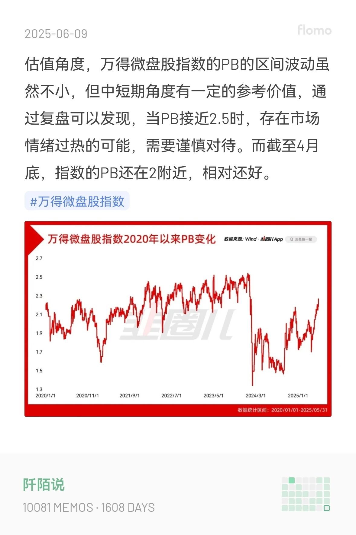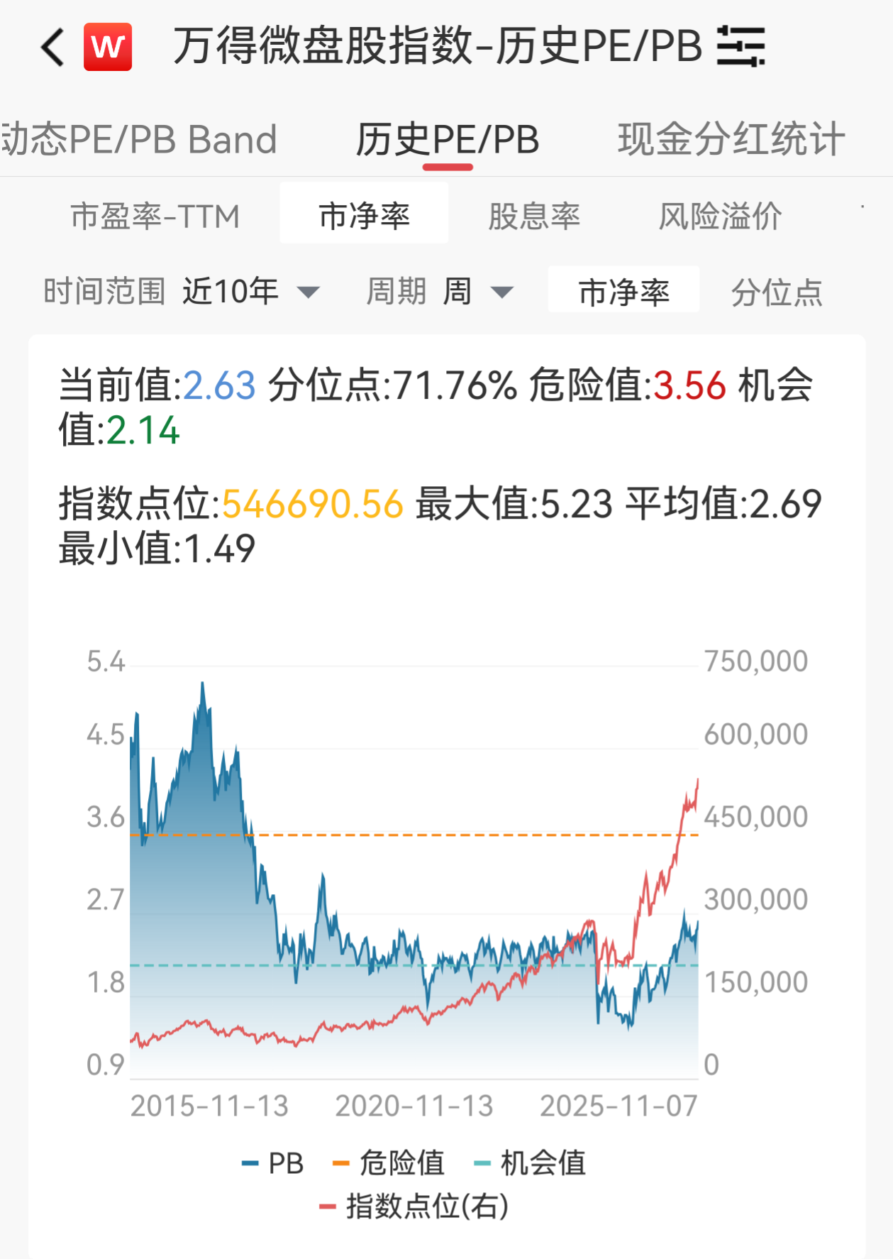 大家周末好,从市净率来看,万得微盘股指数当前2.63倍,处于近十年估值百分位71.76%的位置,危险值在3.56倍,机会值在2.14倍。喜欢微盘股指数,当前上车优选基金还是诺安多策略,虽然限购5万元/天,对小散还是可以的,只不过当前有点热了,如果市净率回调到2.2倍以下可能更好。风险提示:个人观点,仅供参考,不构成投资建议。