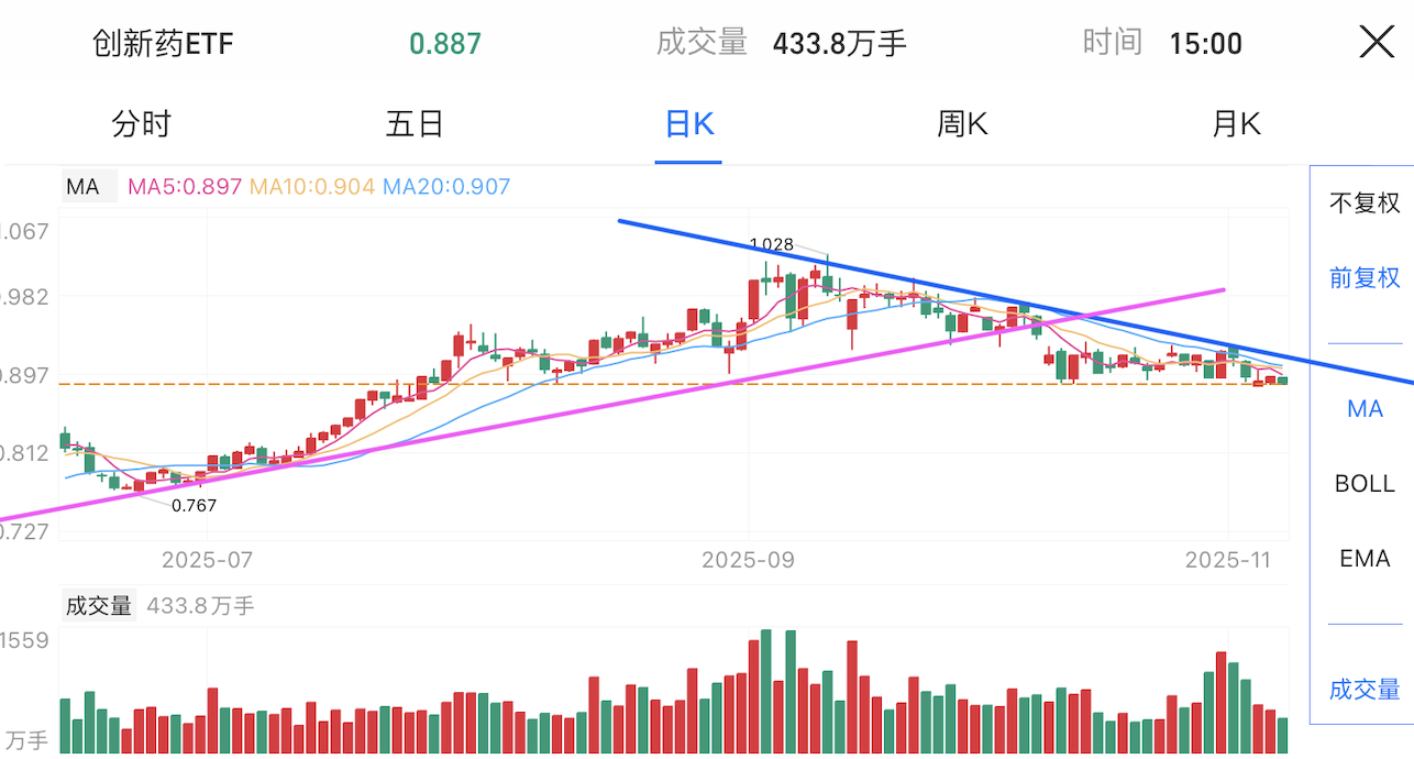 创新药和港股创新药近期在大幅上涨后力竭回落,跌破上涨趋势线,最近在下行途中放量反弹,然而很快回落至支撑位,跌破则再次下行。
