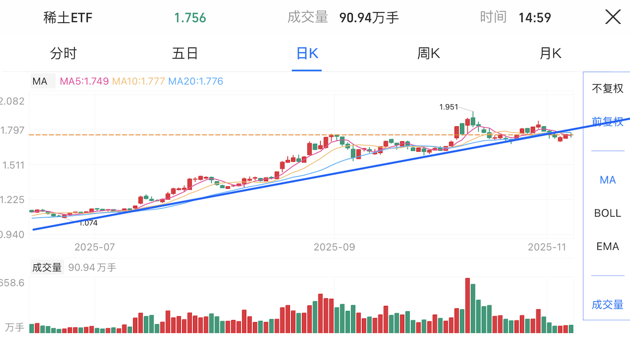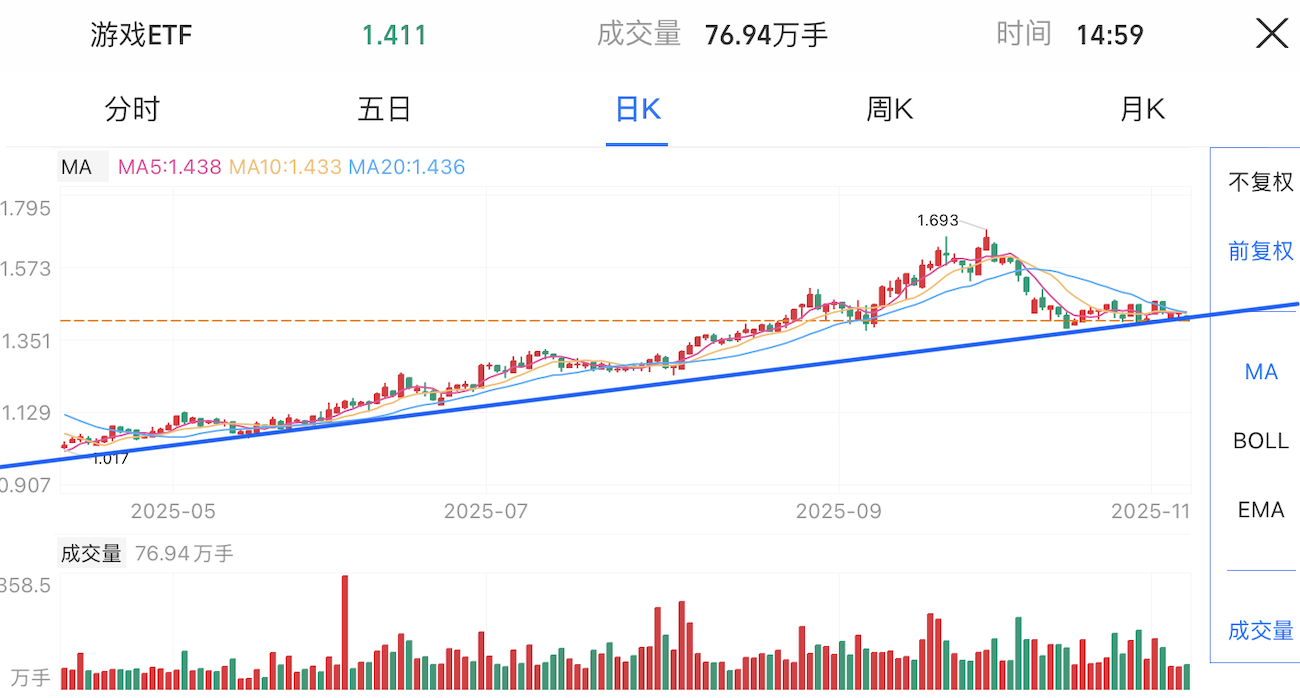 游戏和稀土在一波较大行情后回落,后力竭回落,目前在关键上涨趋势线附近徘徊,跌破则进入回调阶段,目前仍处于盘整期。
