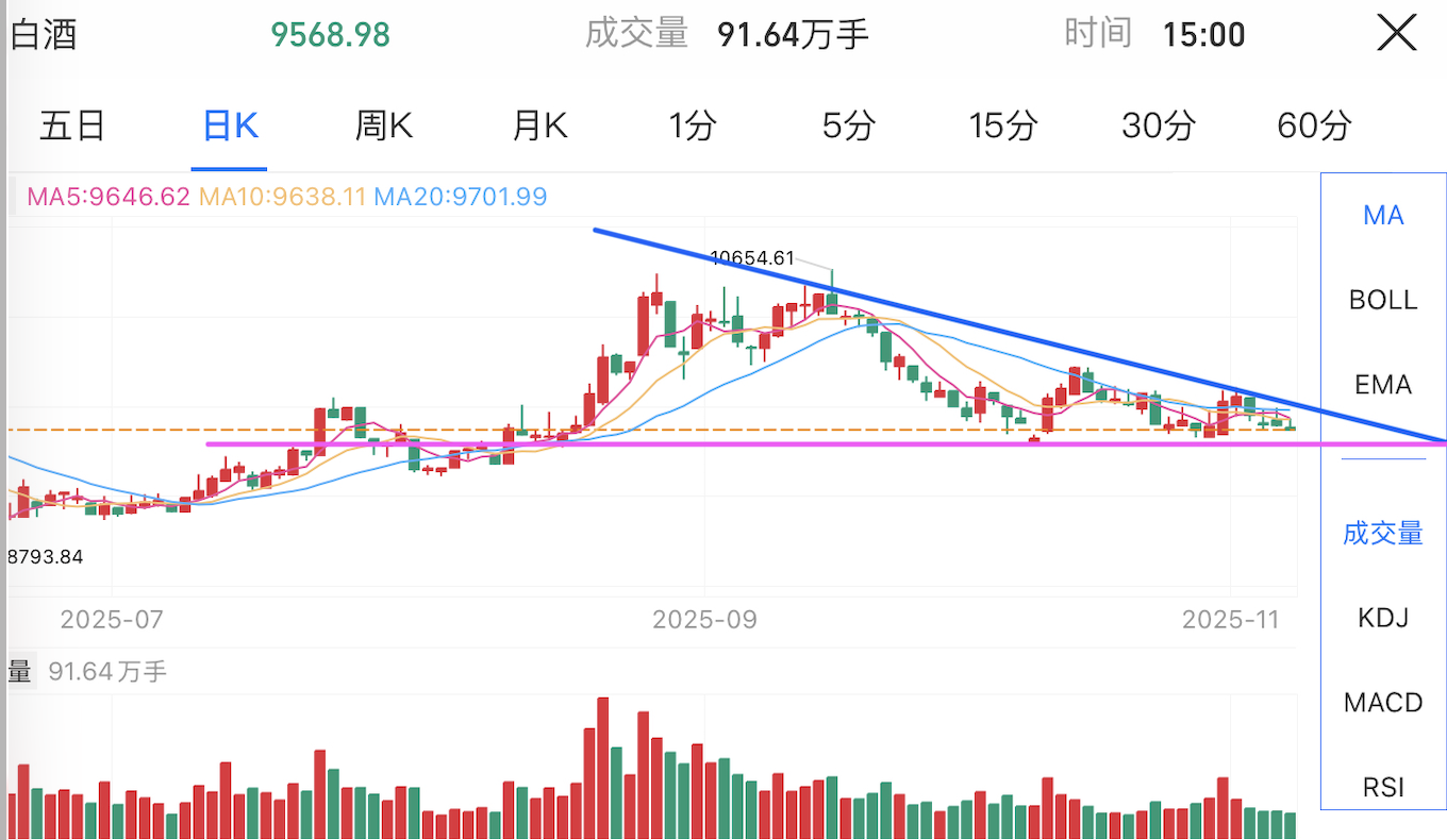 白酒此前短暂反弹,但没能持续涨势,再次回落至前低支撑位,此位置距离最低点不远,较强支撑,但仍没有回升迹象,继续底部盘整中。