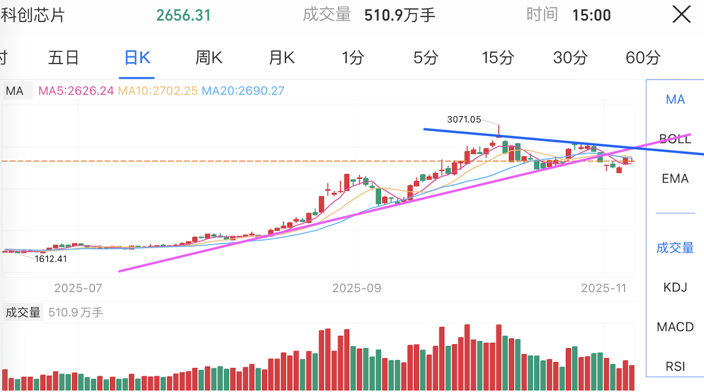 存储芯片和科创芯片此前有较大行情,最近力竭回落,科创芯片甚至跌破上涨趋势线,这几日较大幅度反弹,有止跌回升迹象,但没有突破压力位,仍处于盘整期。