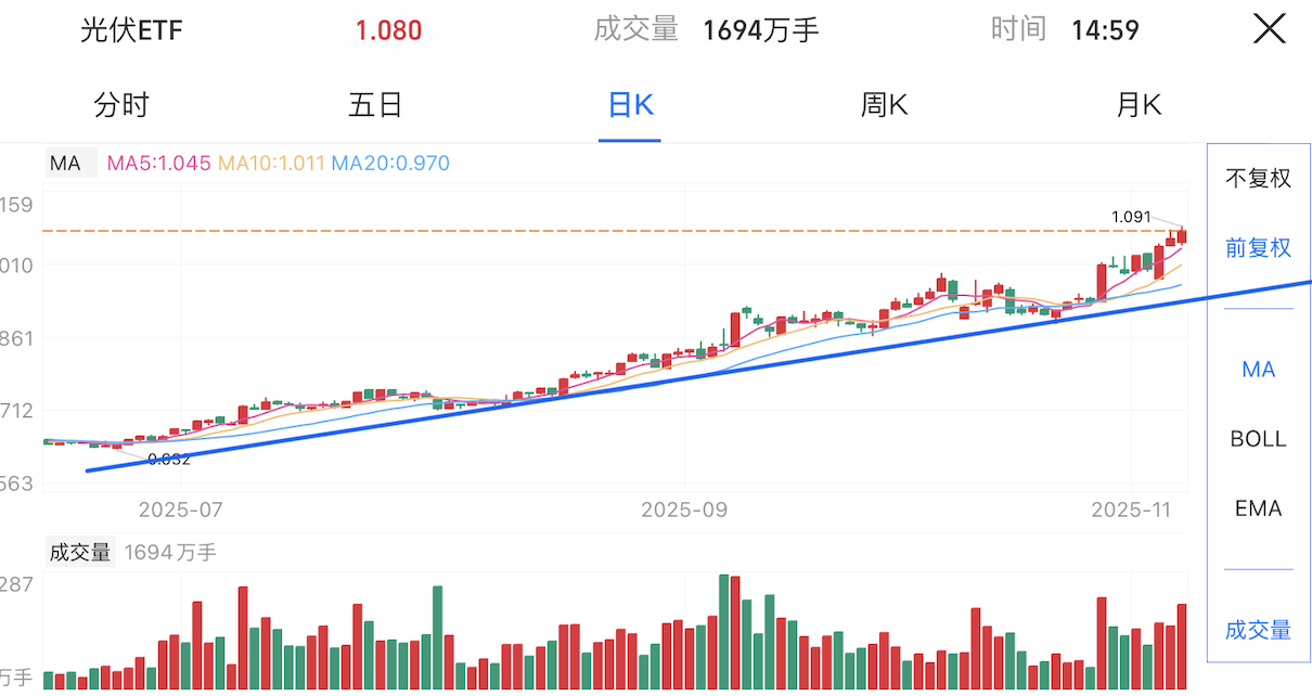 光伏和绿色电力一直震荡上行,最近在短期盘整后突破压力位,再次开启上行模式,目前稳步上升中。