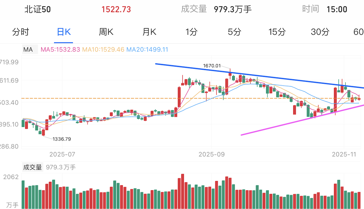 北证50 近期一直处于盘整期,最近在前低支撑位突然放量大涨,然而很快回落,形成对称三角形,此形态后市方向不确定。
