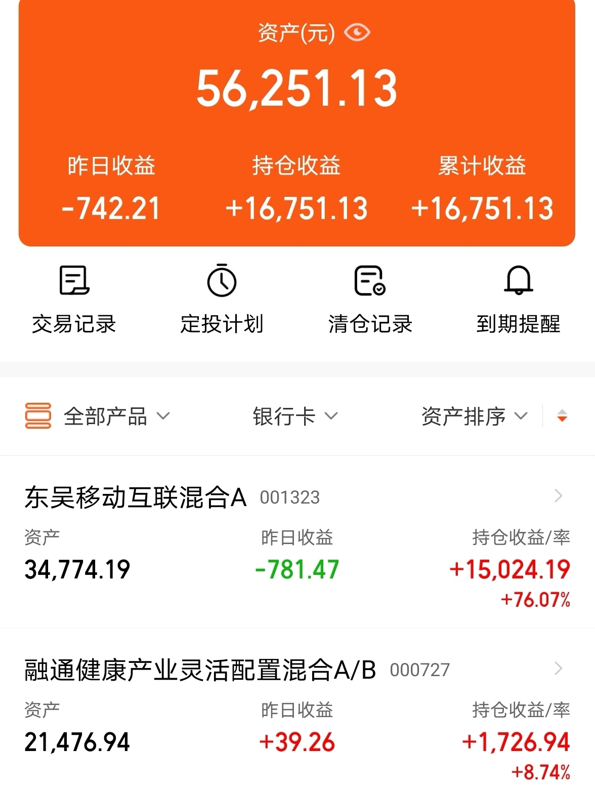 现基金资产56251.13元,盈利16751.13元。其中,融通健康产业收益率为8.74%、东吴移动互联混合A收益率为76.07%。
