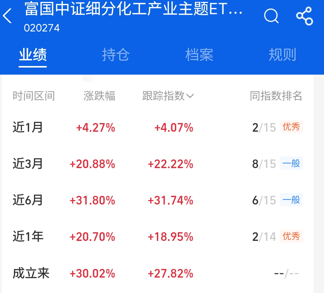要说强者恒强,还得是化工板块。$富国中证细分化工产业主题ETF发起式联接C$ 近半年直接涨了31.8%,实力妥妥在线。反内卷可是长期利好,化工板块现在还处于低估状态,未来发展我超看好。趁现在提前埋伏正合适,我今天已经果断布局500。