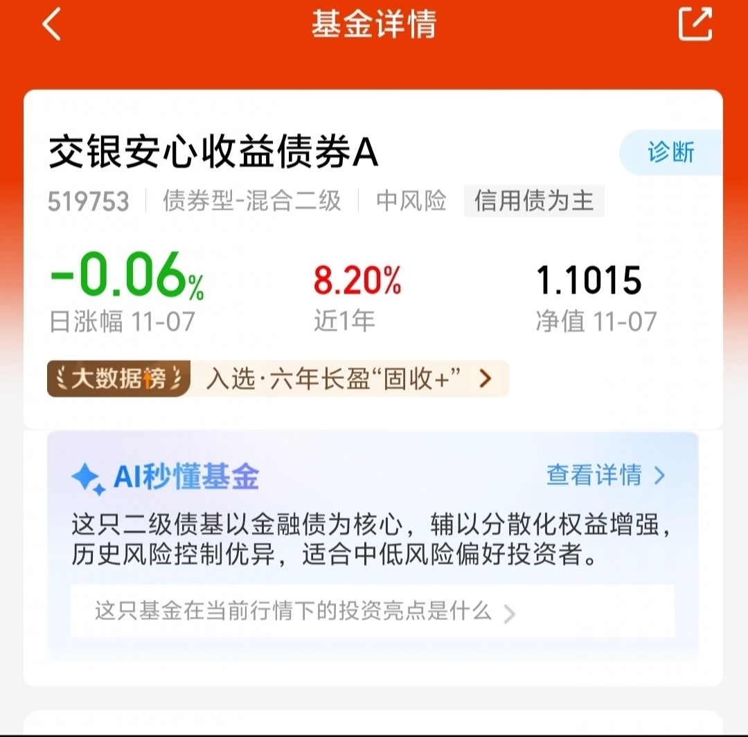 选择交银安心收益A,体验金融债布局的稳稳幸福,金融债板块的低风险、稳收益特性,让投资底气十足;感受分散化权益增强的成长惊喜,专业团队在权益市场的深耕细作,为收益带来更多可能性。作为中风险的二级债基,它适配中低风险偏好者,近1年8.20%的收益、六年长盈“固收+”的认可,全方位展现其在“固收+”领域的专业实力,是稳健理财路上的得力伙伴。