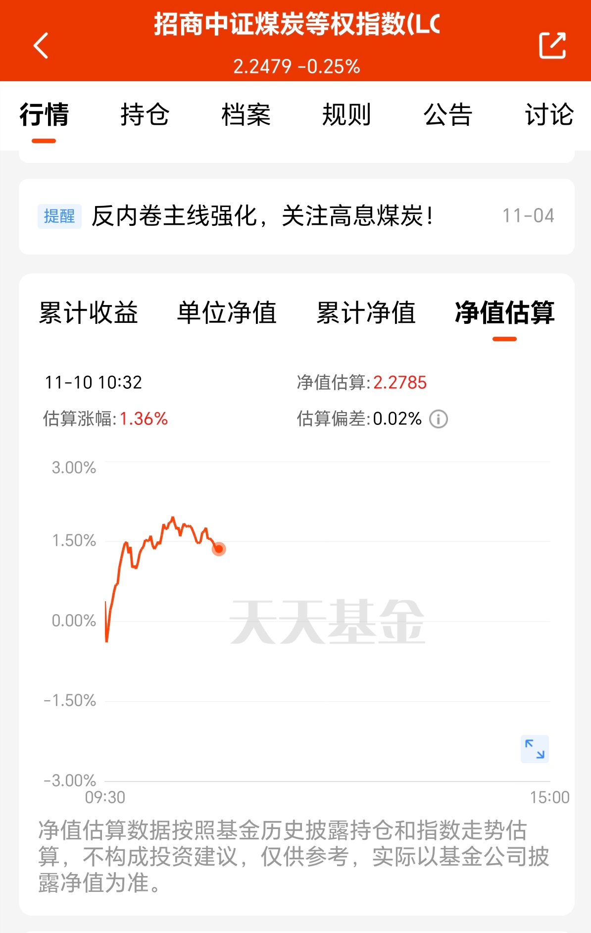 近期煤炭赛道因终端需求积极修复,还有站台贸易商拉运量显著增加,在这些诸多利好消息影响下,从而进一步推高煤炭产业,业绩稳定增长!其中我留意到$招商中证煤炭等权指数(LOF)C(OTCFUND|013596)$聚焦于煤炭全产业链,目前实时估值上涨1.36%,近一月涨幅17.13%,整体业绩表现居前,同时市场情绪看涨也愈发浓郁,我觉得可以用中长期的角度安心持有!