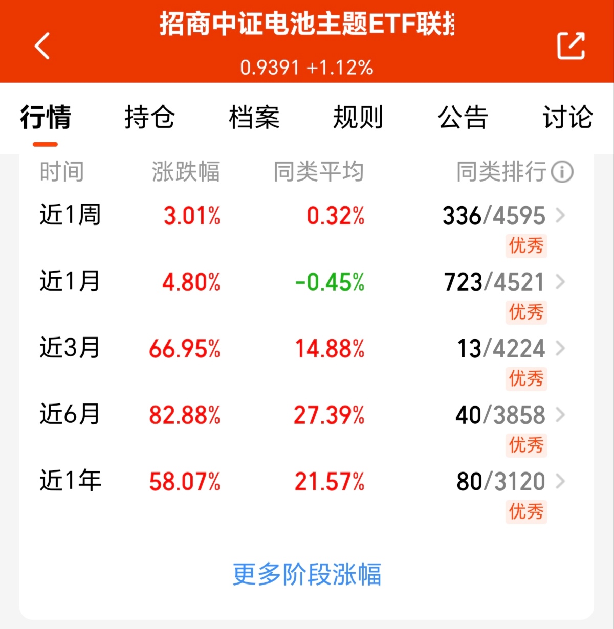 今日大盘行情震荡分化明显,但近期电池赛道持续火热,带来一波连续上涨趋势,特别是$招商中证电池主题ETF联接C(OTCFUND|016020)$上周五涨幅1.12%,近三个月涨幅66.95%,虽然近期涨幅已经不少,但固态电池核心标的,当前风险释放的相对充分,各大权威媒体也在持续关注行业进展,给予行业先进技术充分关注,所以我觉得前景还非常可期!