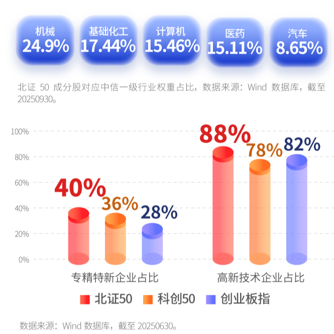 近年来,随着我国多层次资本市场体系不断完善,北交所作为服务创新型中小企业的主阵地,战略地位与市场关注度持续提升。北证50成份指数汇聚了北交所市值规模大、流动性强、最具代表性的50家上市公司。截至2025年6月末,北证50成分股40%为专精特新企业,88%为高新技术企业,与国家政策导向高度契合。从行业分布来看,北证50成分股主要聚焦硬科技领域,覆盖半导体、生物医药等高新技术细分赛道,同时集中度相对分散,可以在一定程度上分散风险。