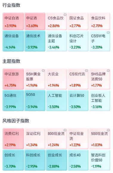 白酒、食品饮料和旅游等涨幅靠前,通信设备、科创芯片设计、电子等下跌。