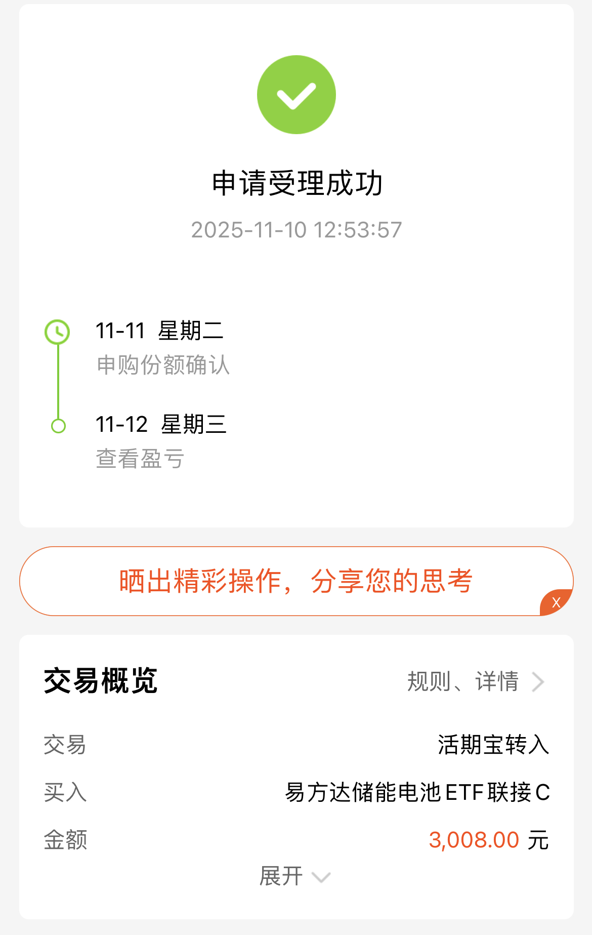 今天大盘震荡走势,截止午盘三大指数全绿,不少板块调整,电池方向也跟着调了。不过储能热度一直没降,我打算加仓易方达储能电池ETF联接C,它是市场里唯一主投储能的产品,近三月涨了49.39%、半年涨67%,重仓阳光电源、宁德时代这些龙头。现在储能是主线,今天调整正好低吸,这基精准卡着核心赛道,后续行情肯定能跟上,我继续看好它的表现。