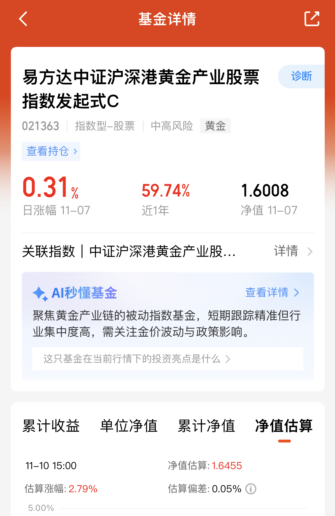 今天黄金板块势头真猛,现货金价重新站上4000美元关口。美政府停摆虽结束,但不确定性没消,加上美劳动力市场疲软、消费者信心下滑,避险情绪还在发酵。我持有的$易方达中证沪深港黄金产业股票指数发起式C(OTCFUND|021363)$今天估值涨了2.79%,这波行情踩得挺准。看当前避险逻辑没松动,金价支撑足,我也分批布局起来,期待收益在创新高。