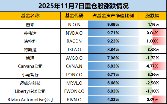 【十大持仓】根据最新披露的基金定期报告,截至2025年三季度末,华宝海外新能源汽车前十大重仓股包括蔚来、英伟达、法拉利、博通、特斯拉、Carvana公司、小马智行、迈威尔科技、Liberty传媒公司、Rivian Automotive公司,占基金资产净值比例合计为75.42%。
