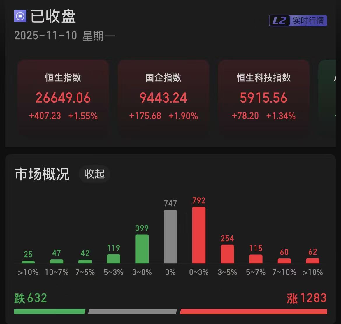恒生指数上涨1.55%,国企指数上涨1.90%,恒生科技指数上涨1.34%。1283只个股上涨,632只个股下跌。南向资金,净买入66.54亿港元。