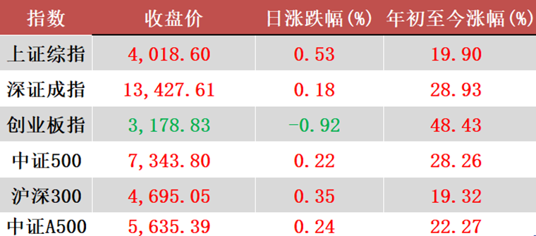 国内主要股指涨多跌少。截至收盘,上证指数涨0.53%,收报4018.6点;深成指涨0.18%,报13427.61点;创业板指数跌0.92%,收报3178.83点。两市成交额21744亿元。行业方面,申万一级涨多跌少,美容护理领涨,涨幅为3.6%;电力设备领跌,跌幅为1.09%。