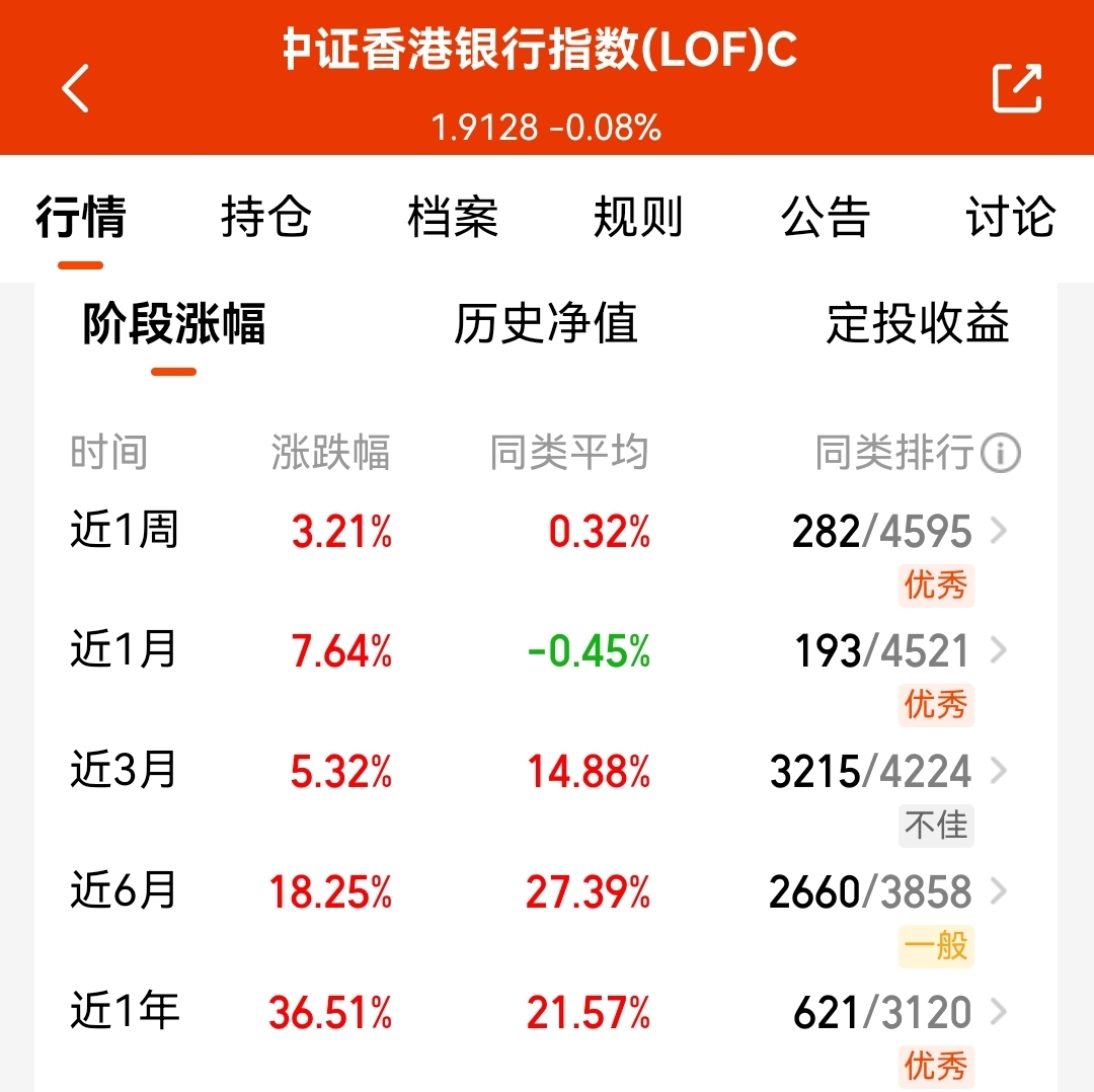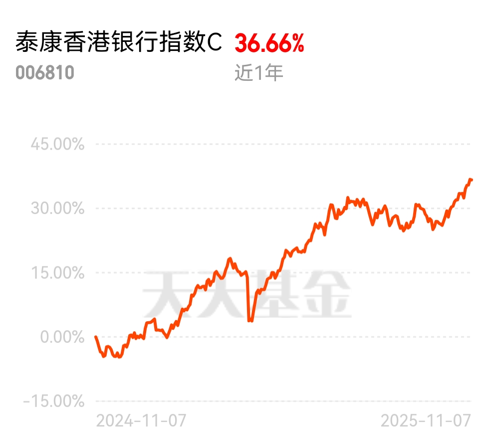 CPO芯片等科技板块止盈期间,作为防守的银行板块趋势较好,我比较看好这支$泰康香港银行指数C$ ,近1个月涨了7.65%,近1年收益36.66%了,甚至跑赢纯红利板块,抗跌性能更好;