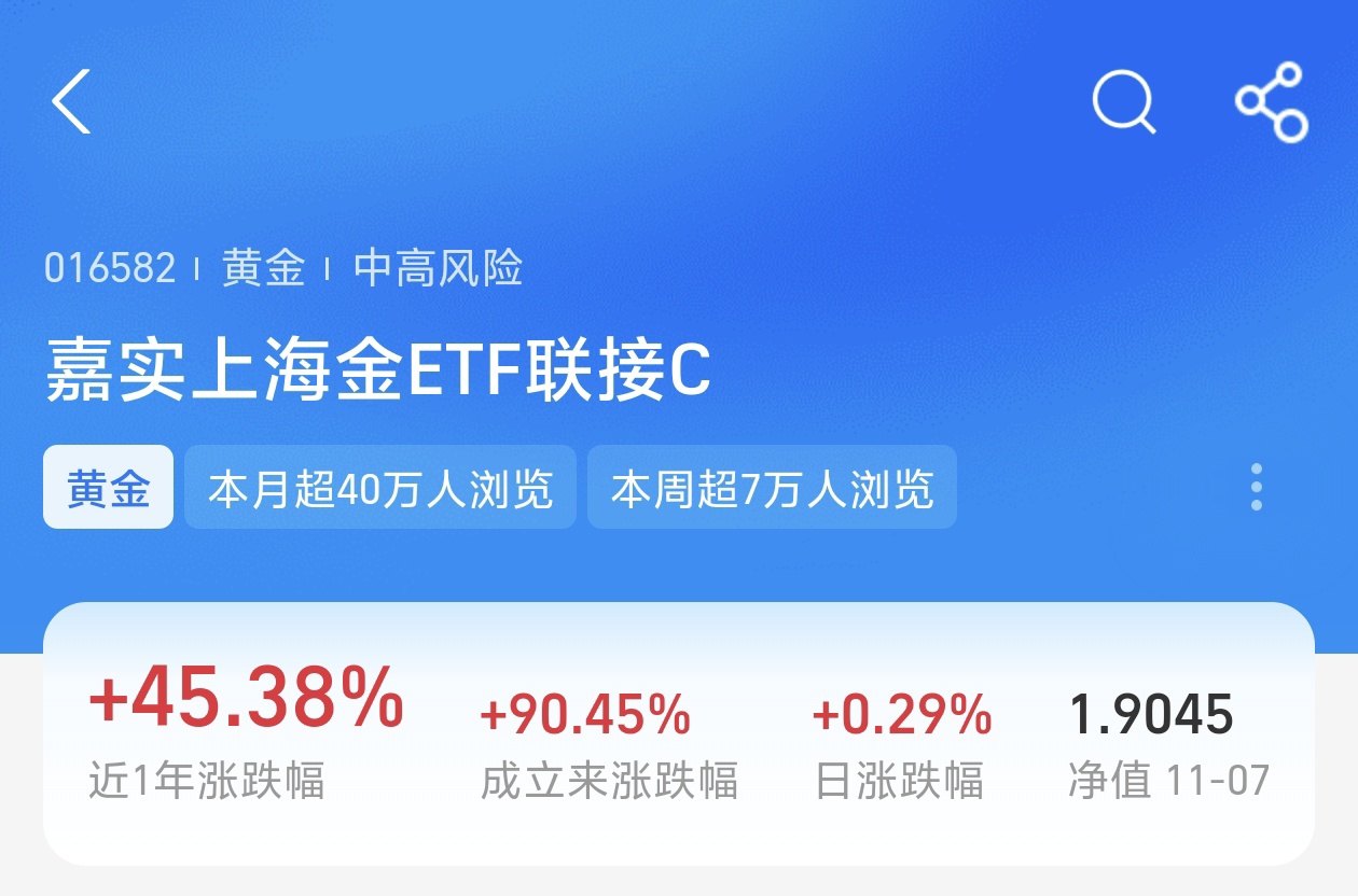 $嘉实上海金ETF发起联接C$ 基金近期表现的也是非常的优秀,近三个月上涨了16.18%,近一年的收益率高达45.38%,盈利能力强。各阶段业绩在同类基金排名领先。最新消息,基金在讨论区6楼,持有嘉实黄金100元以上就能领到0.58元菜包;持有1000元以上就能领到0.88元肉包。肉包是每周更新,这次没领上的,下周可以试一试。目前全球贸易的不确定因素导致避险情绪升温,各国央行也在持续的购金,黄金上涨潜力大,期待后期收益,坐等吃肉。
