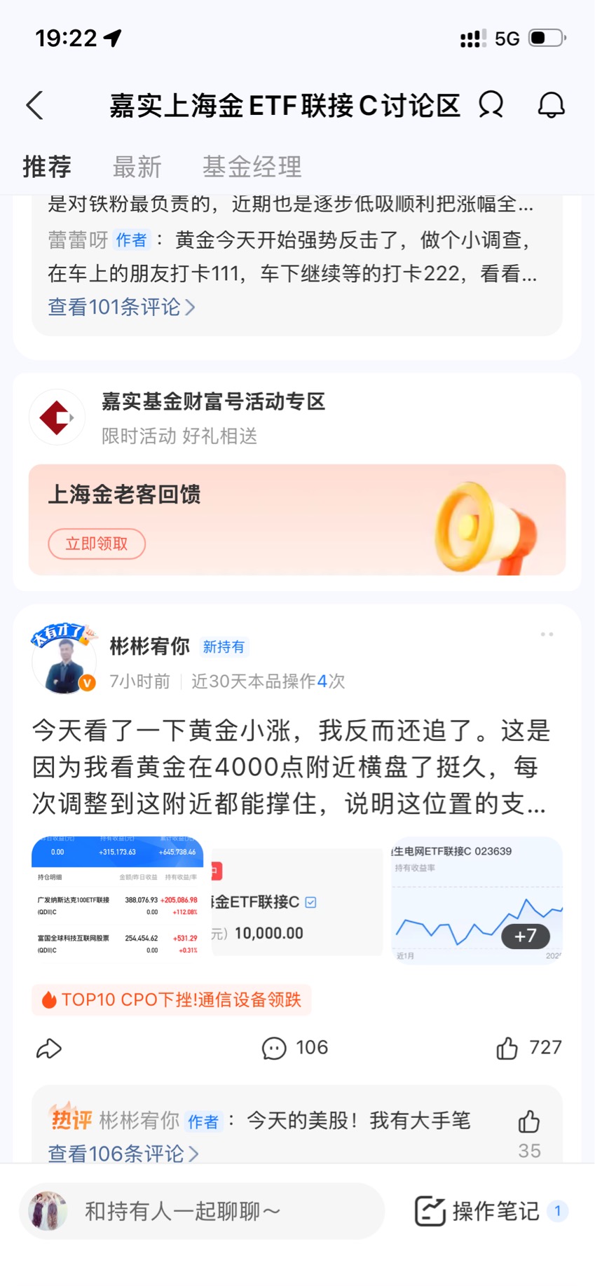 我发现嘉实领红包活动还在继续,嘉实上海金的老客活动,好像持有金额100以上就能领红包了,每周更新,领到2次了,可以去看看,在$嘉实上海金ETF发起联接C$ 讨论区6楼,领到加仓,黄金市场渐渐回暖,可以试试,差不了的。