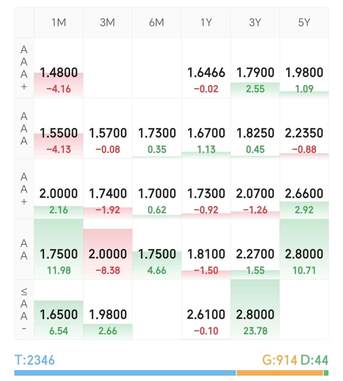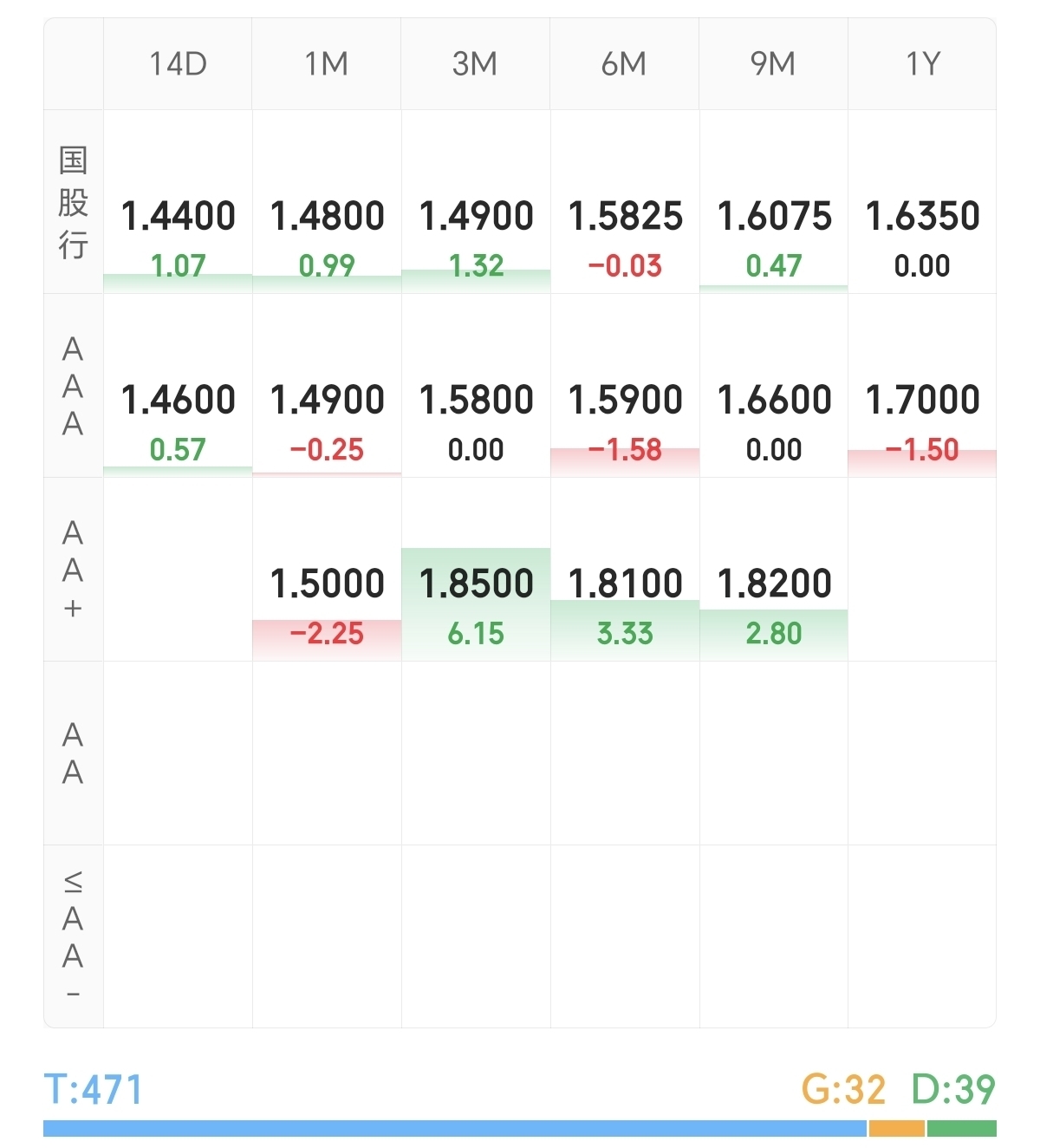 今日公开市场净投放416亿,资金面情绪指数49,DR001、DR007小幅上涨,分别在1.4%、1.5%左右。