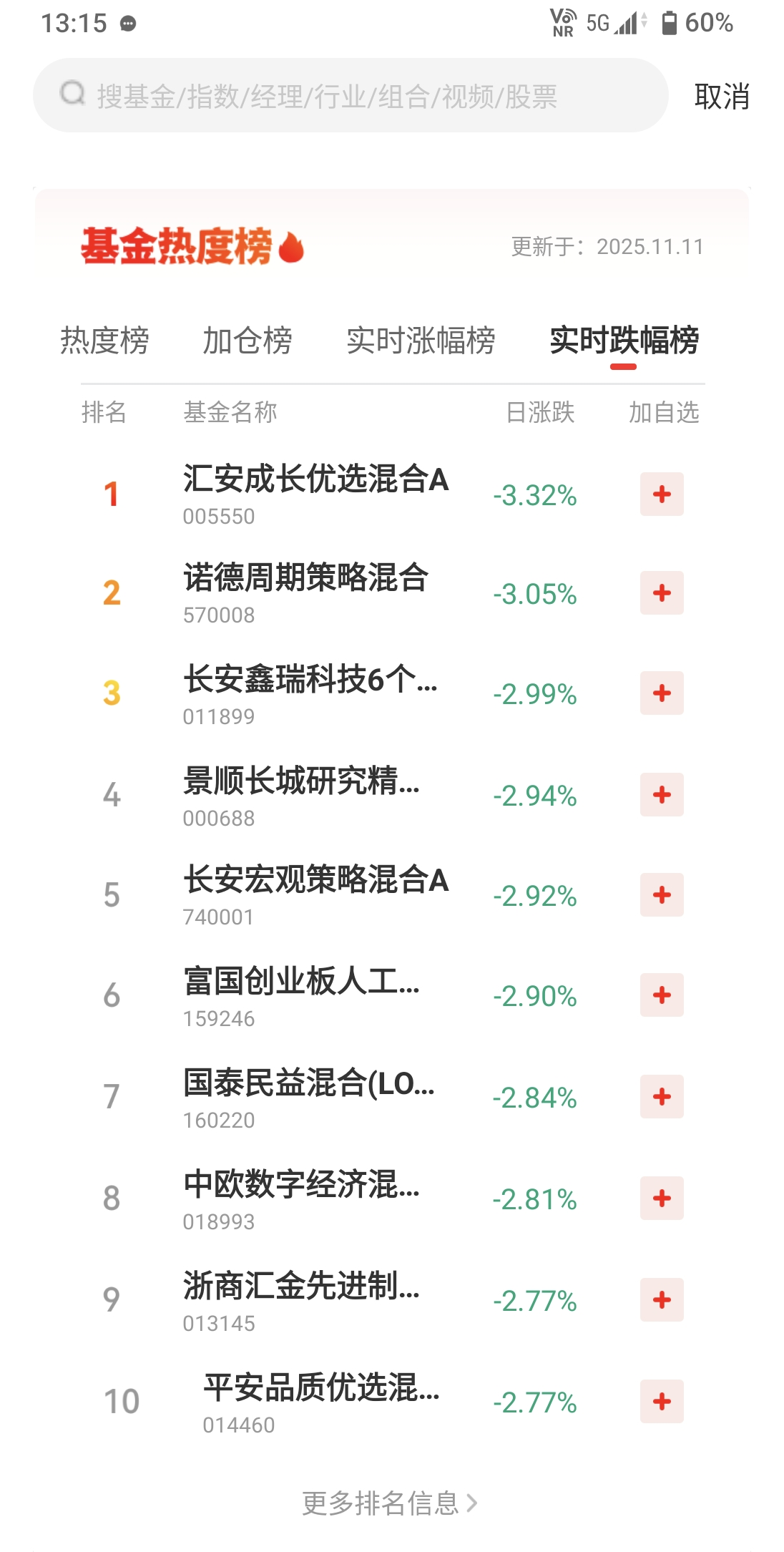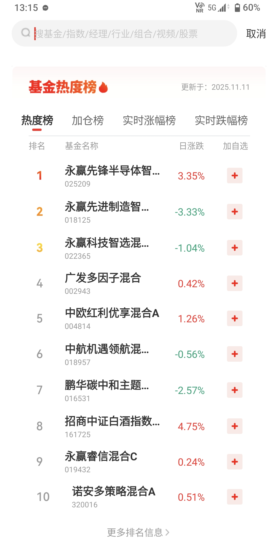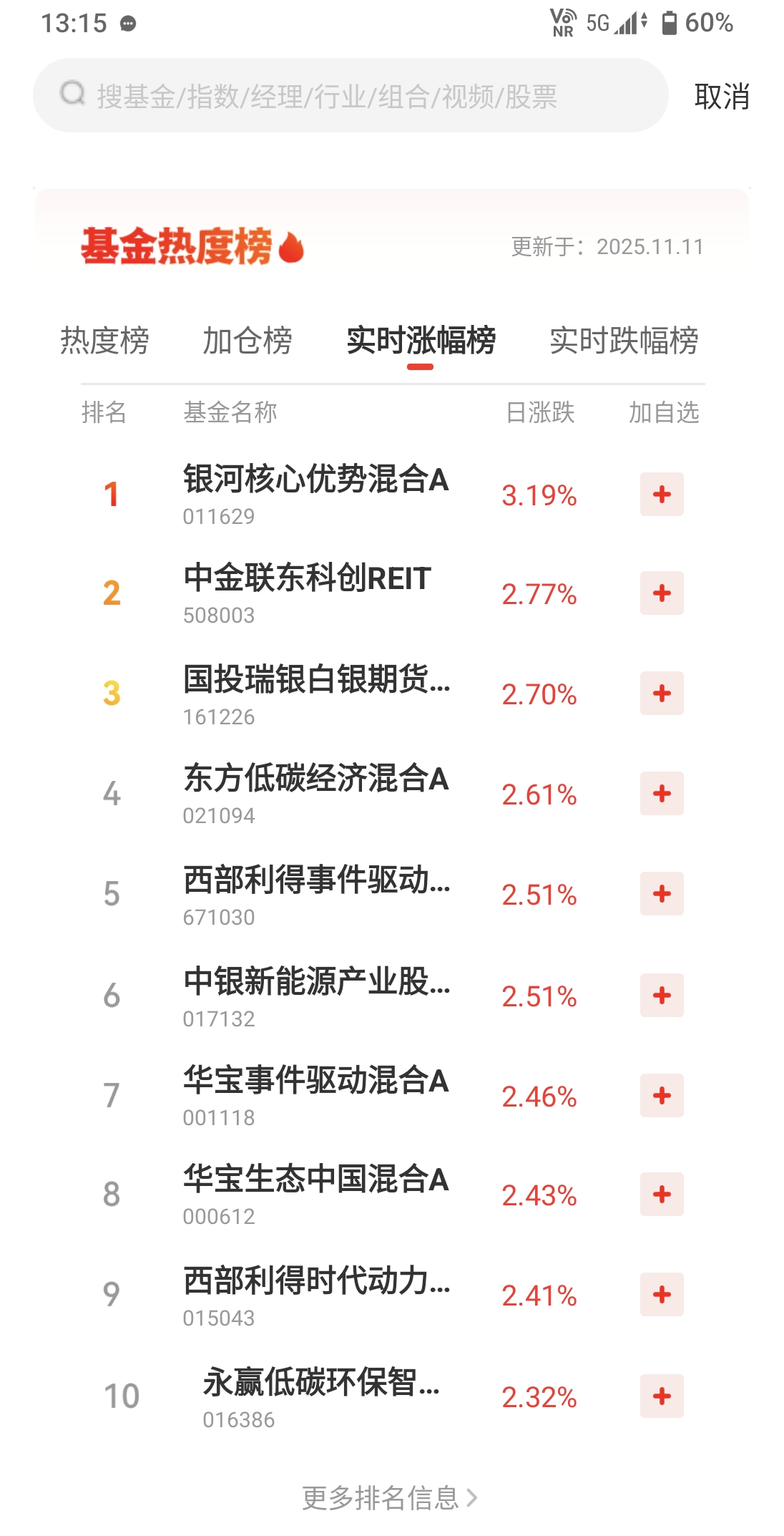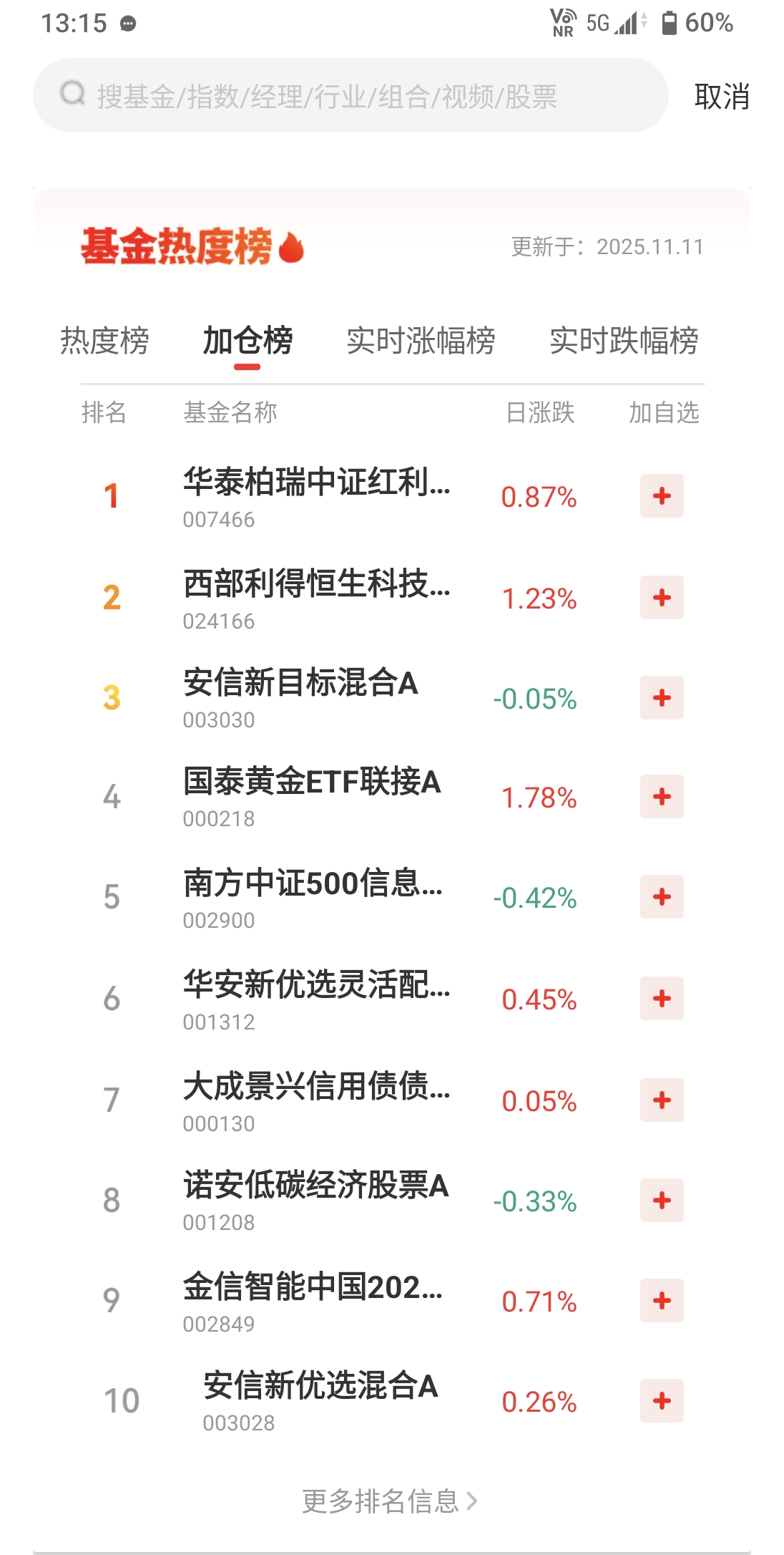 11月11日基金热度榜,加仓榜,实时涨跌幅榜